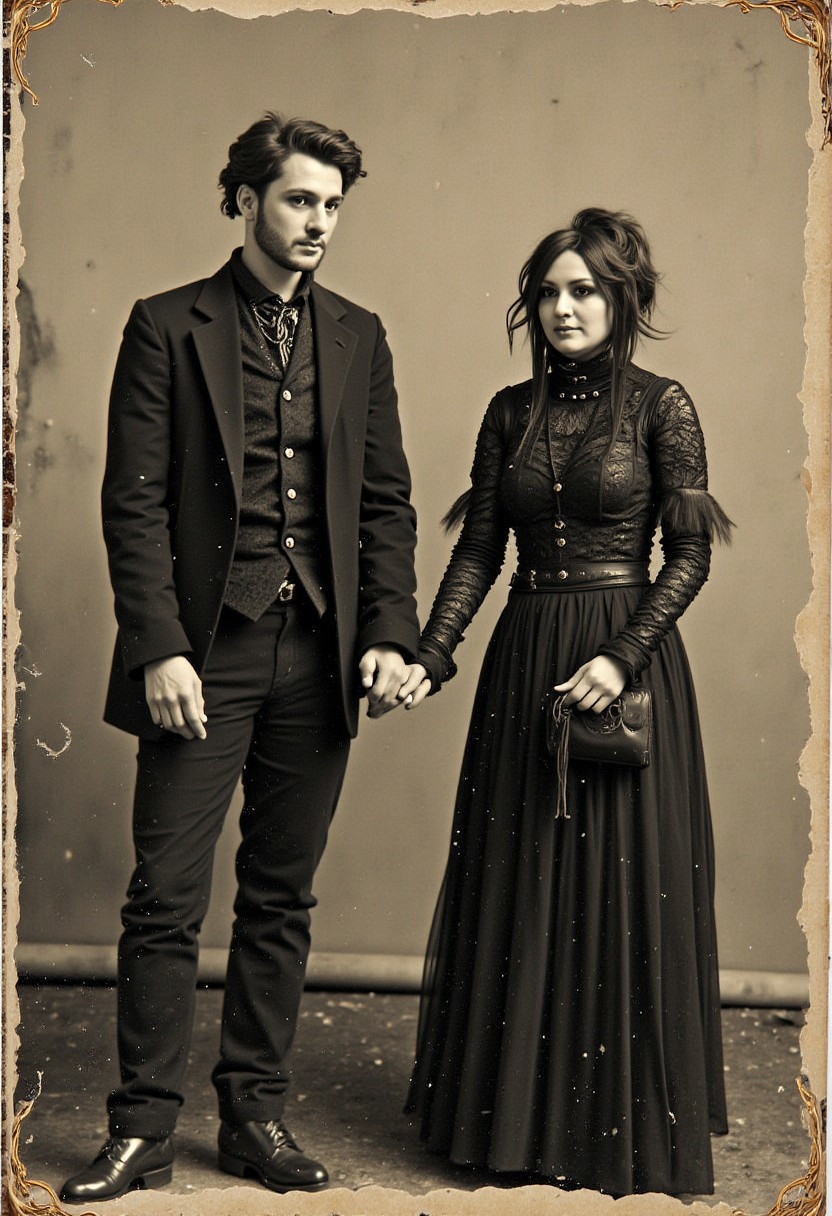 a worn out gothic vampire couples photograph from 1863, sepia, good condition. the man and woman wearing punkish clothing, holding hands smiling with a subtle gothic punk tone