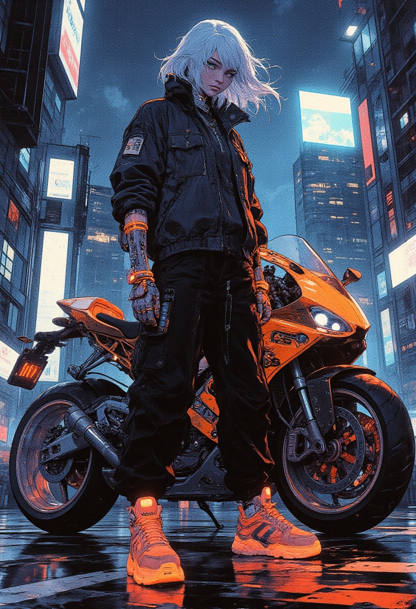 A hyper-detailed full-body **illustration** in **anime, cyberpunk, ne0nfant4sy** style, portraying a futuristic female model standing in a high-tech, neon-lit cyberpunk world. She wears oversized **black cargo pants** with intricate stitching, paired with **luminous orange platform sneakers** from Rick Owens' *Neon Abyss* collection, seamlessly blending avant-garde techwear with bold street aesthetics. Her **perfectly anatomical arm** is fitted with an **AI-controlled, high-tech robotic arm cuff**, its neon circuitry pulsing faintly, while sleek **metallic rings** wrap around her neck and wrists with mechanical precision. Her **slick, shoulder-length white hair** flows dynamically behind her, captured mid-motion as if caught in an artificial wind. Beside her stands a **futuristic flying motorcycle**, its intricate mechanical surfaces gleaming with polished **metallic textures and pulsating neon accents**, exuding cutting-edge design. The environment is bathed in **sinful lighting**, where deep shadows and dramatic highlights emphasize the interplay of cold metallic tones against the vibrancy of artificial illumination. The desaturated cyberpunk skyline in the background flickers with digital billboards and glitching holographic projections, reinforcing the dystopian atmosphere. A subtle layer of **gritty noise** enhances the tactile realism, blending the surreal and futuristic into an immersive, cinematic composition. 8K, HD, HIGH RESOLUTION, MASTERPIECE, AWARD WINNING.