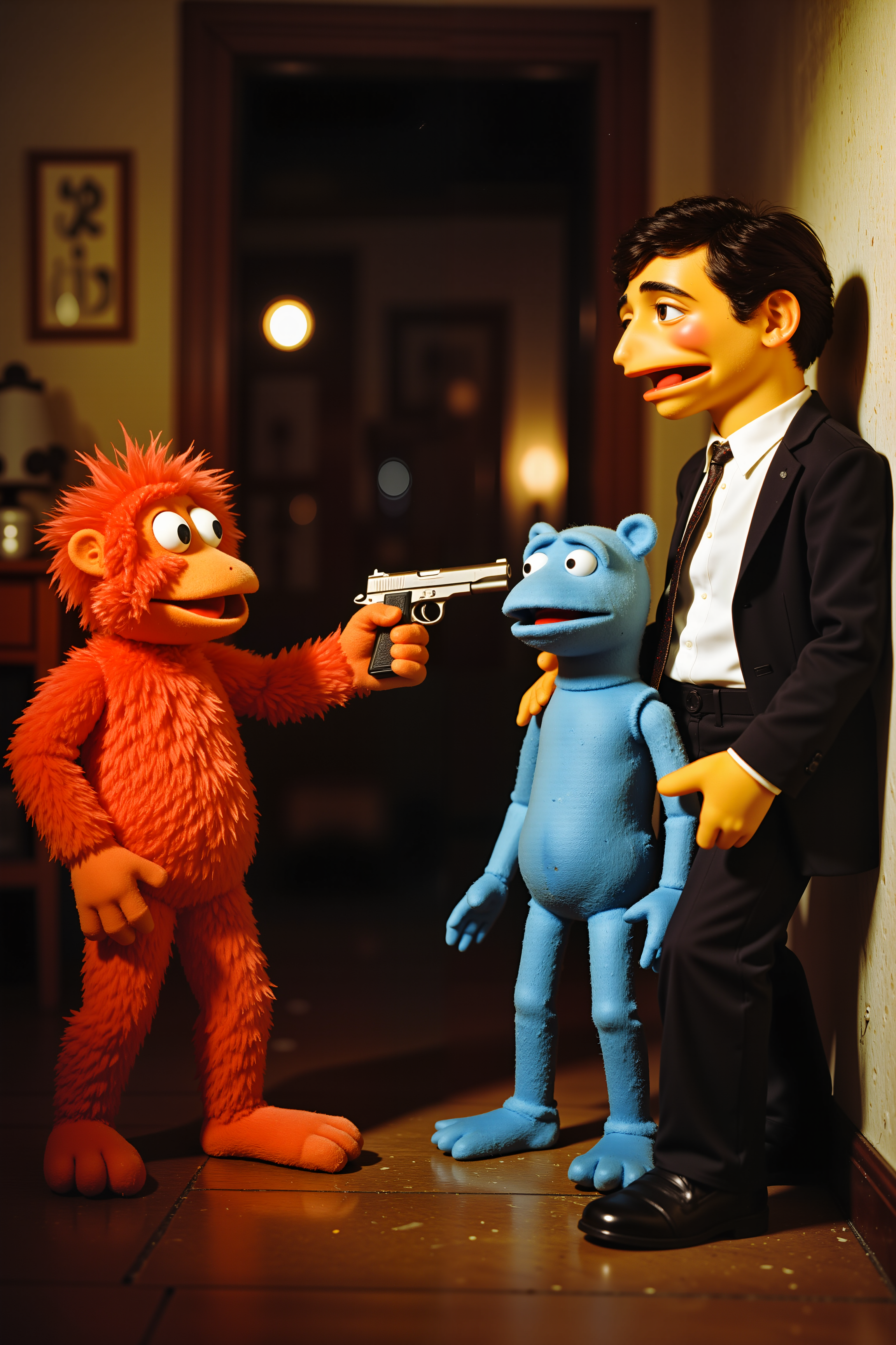 The legendary âSay what againâ scene from Pulp Fiction is reimagined with fuzzy, felt puppets, creating a bizarre yet hilarious contrast between their soft, friendly forms and the intensity of the moment. Puppet Jules, a bright red, shaggy creature with googly eyes, points a ridiculously oversized cartoonish gun at a trembling blue puppet who cowers against the backdrop of a dimly lit apartment. Puppet Vincent, a lanky, yellow-furred creature with floppy arms and an ill-fitting black suit, leans casually against the wall, watching the scene unfold with his stitched-on, unblinking expression. The grimy, sunlit apartment remains faithful to the original set, but the puppet charactersâ exaggerated mouths, felt-textured features, and floppy movements add a layer of absurdity to the moment. Even the tension in the air is palpable, despite the undeniable silliness of seeing violent crime enacted by fuzzy, Muppet-like creatures. , detailed background Fantastic lighting. Detailed shadows.intricate details, vivid colors, hyper-detailed, ultra-sharp, , <lora:sxz-Vintage-Fantasy-Flux:0.45><lora:n30nfilm:0.8><lora:lith_mimosa_kiel_grw134_FLUX:0.45><lora:DreamArtFluxV1.0:0.55><lora:shrooms-house-000012:0.3>