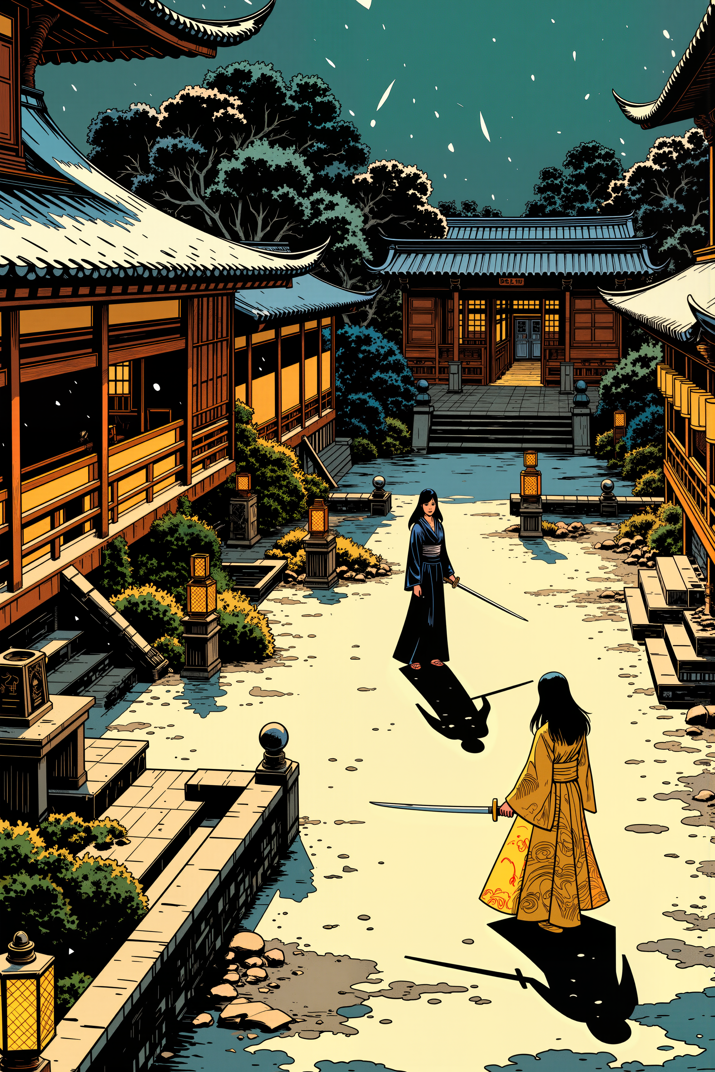 The Final Duel from Kill Bill, but Everything is Paper Cutouts â In the serene courtyard of a traditional Japanese temple, a delicate paper version of The Bride stands poised with a katana, her silhouette cut from a single sheet of golden parchment. Across from her, a paper-thin O-Ren Ishii, clad in an intricately folded kimono, holds her sword at the ready, her crimson-painted lips frozen in an expression of calm defiance. The falling snow is crafted from tiny, intricately cut flakes, each piece scattered delicately across the flat-paper ground. The glowing lanterns lining the garden flicker softly, their light creating long, elegant shadows that stretch across the scene, their edges crisp and impossibly precise. Every tree branch, every ripple in the koi pond, every strand of hair is a perfectly cut layer, meticulously arranged to bring this frozen moment of tension to life in a world of delicate, two-dimensional artistry. , detailed background Fantastic lighting. Detailed shadows.intricate details, vivid colors, hyper-detailed, ultra-sharp, , ,meiman_style,This is a retro comic book style digital illustration, <lora:meimanstylev2:0.4><lora:Vintage comic book:0.4><lora:RetroAnimeFluxV1:0.15><lora:Greg_Capullo_style:0.4><lora:jeanClaude_Mzires_Style_FLUX-000001:0.4><lora:Flux_Ink_Anime:0.4>