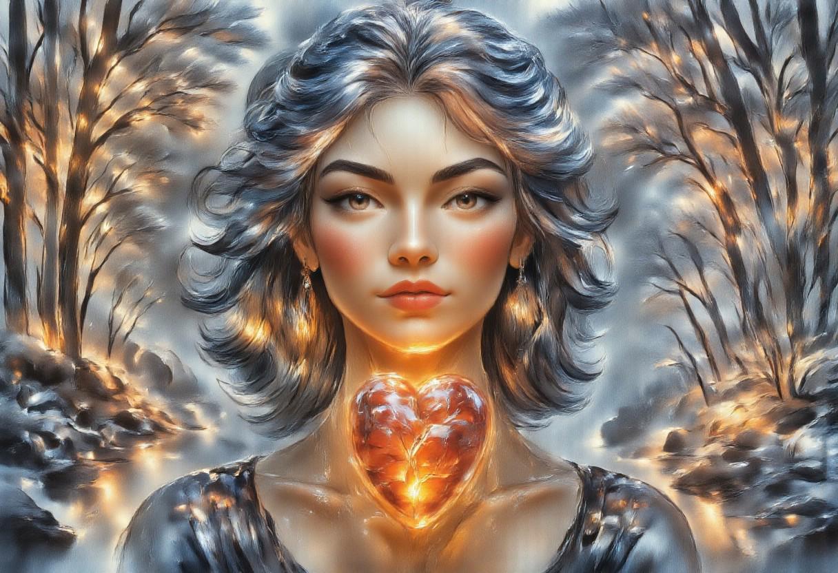 Valentine's Day theme On Valentine's Day, we present a realistic scene that shows a woman with red lips, short blonde hair flowing down, and half-closed eyes. She holds a glowing glass ball in the shape of a broken heart and seems to be praying, being behind frosted glass, on which water droplets can be seen. Her face is completely covered in frost, giving the impression that she is inside the stage. The whole painting is made in the technique of double exposure: a forest behind textured double frosted glass with obvious water drops covers the entire canvas. Frosty vibrations created with the help of double frosted glass effects create an atmosphere of fabulousness and mystery. A 3D textured brush stroke, dark background, and shades of white, red, black, gold, blue, and bronze inspired by nature create a harmonious mix of colors. The pastel color palette, the most free watercolors and whimsical natural motifs give the picture a unique charm and originality. Realism and ink painting give it a special charm.
