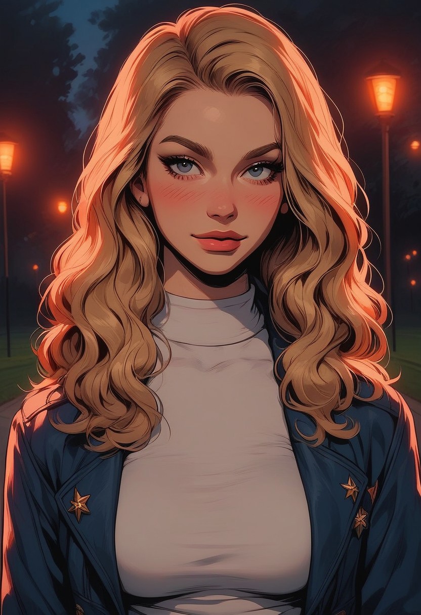 (Score_9, score_8, score_7_up, (((High Resolution, Best Quality)))) Carol Denvers, Jacket, Long hair, Confidant smile, Confidant eyes, Blush , Natural breasts, Tight Tshirt, Park, Natural light on her skin, Looking with love, Captain Marvel, Soft lips, Beautiful face, Gorgeous lights on her skin, Depth_of_field, Proposal of her love for you