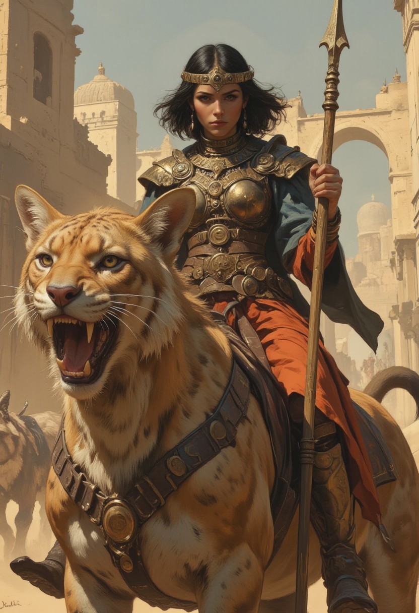 By Phandigrams, fantasy painting, close-up digital portrait of an ancient bronze armored bronze age Egyptian female warrior riding on a humungous African wildcat holding a bronze lance, ancient battlefield background, high action pose, perfect pupils, insanely detailed faces, correct digits, realistic skin, intricately detailed, perfect expressive eyes, perfect pupils, Stunning visuals, Texture, beautiful face features, dynamic, MurphFSF