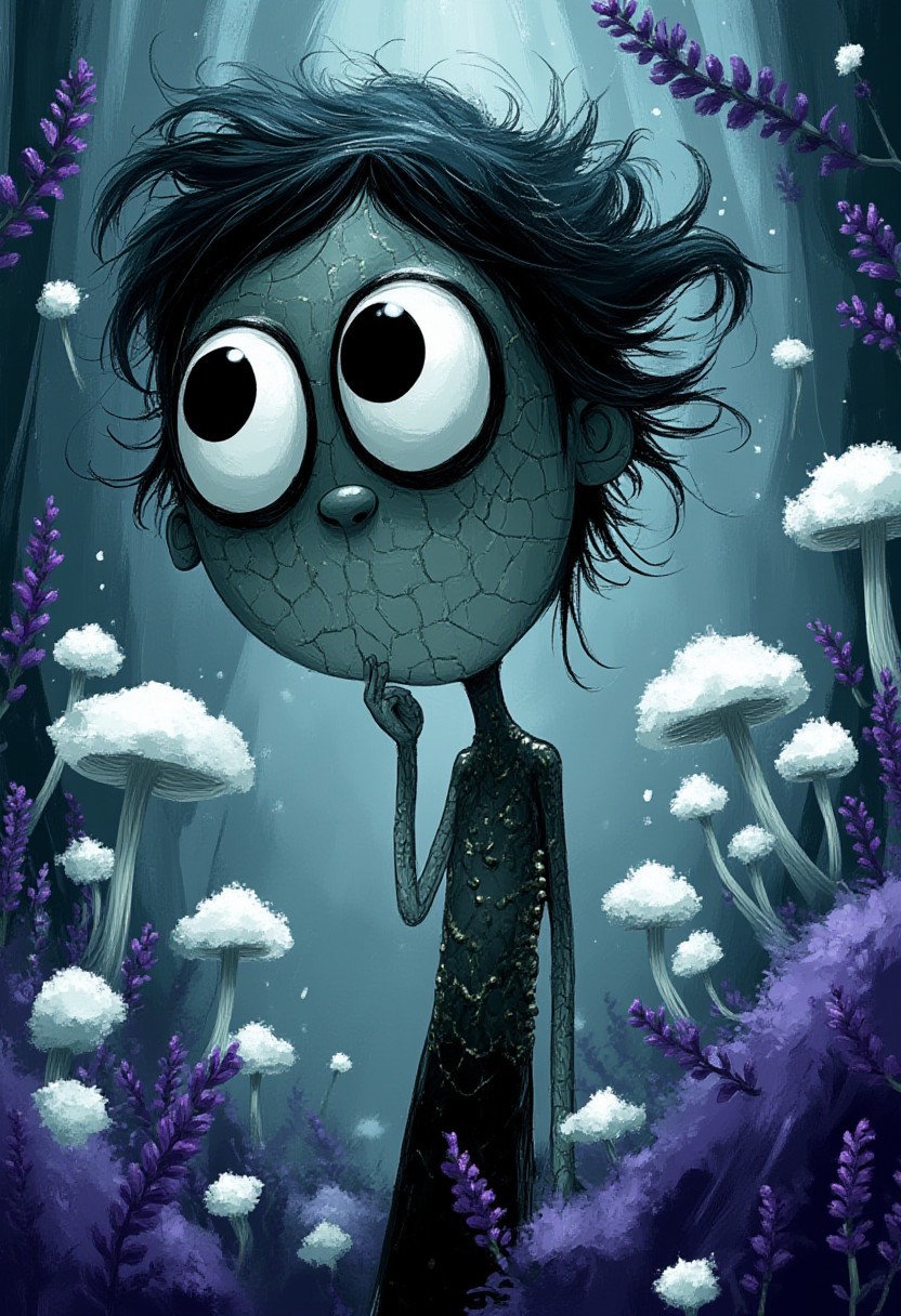 A whimsical illustration of a lanky, elongated woman with enormous, haunting pure white eyes in dark whimsical art style, her impossibly thin fingers delicately touching her pointed chin, skin like cracked porcelain with intricate black fissures stretching across her face, decorated with dripping black beads that catch moonlight, wild flowing black hair moving like smoke, digital painting with ethereal brushstrokes showing delicate textures of broken porcelain and gleaming beads, surrounded by purple lavender and white ghost mushrooms creating misty glow, twilight forest background, characteristic Tim Burton inspired design with eyes appearing like empty moon mirrors