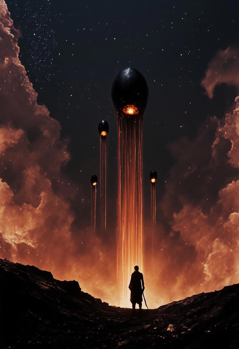 ((photo tilt-shift, unexpected angle of view, with complex colors, top view, bokeh effect)) photo of a black sand desert, several giant black otherworldly creatures with cable-like hanging tentacles are floating in the starry sky, a faint red sun barely shines through the cloud cover, highly detailed, cinemascope, moody, epic, photorealistic, color graded cinematic, atmospheric lighting, award winning photo, film grain (((iconic futuristic-sci-fi luminous but extremely beautiful))) (((light vibrant solid colors))) (((Chiaroscuro light Creme colors background))) (((view macro zoom, wide angle, close up))) (((open spaces background))) (((intricate details,masterpiece,best quality,hyperrealistic,mystical))) (((gorgeous,voluptuous))) (((by Gustave Dor�� style, by Diane Arbus style))) ,(((masterpiece))), (((volumetric lighting, high resolution, 8k, best quality, hyper detailed, ultra detailed, ultra high definition, 8k, super sharp focus, great detail of skin, award-winning photo for its artistic beauty)))