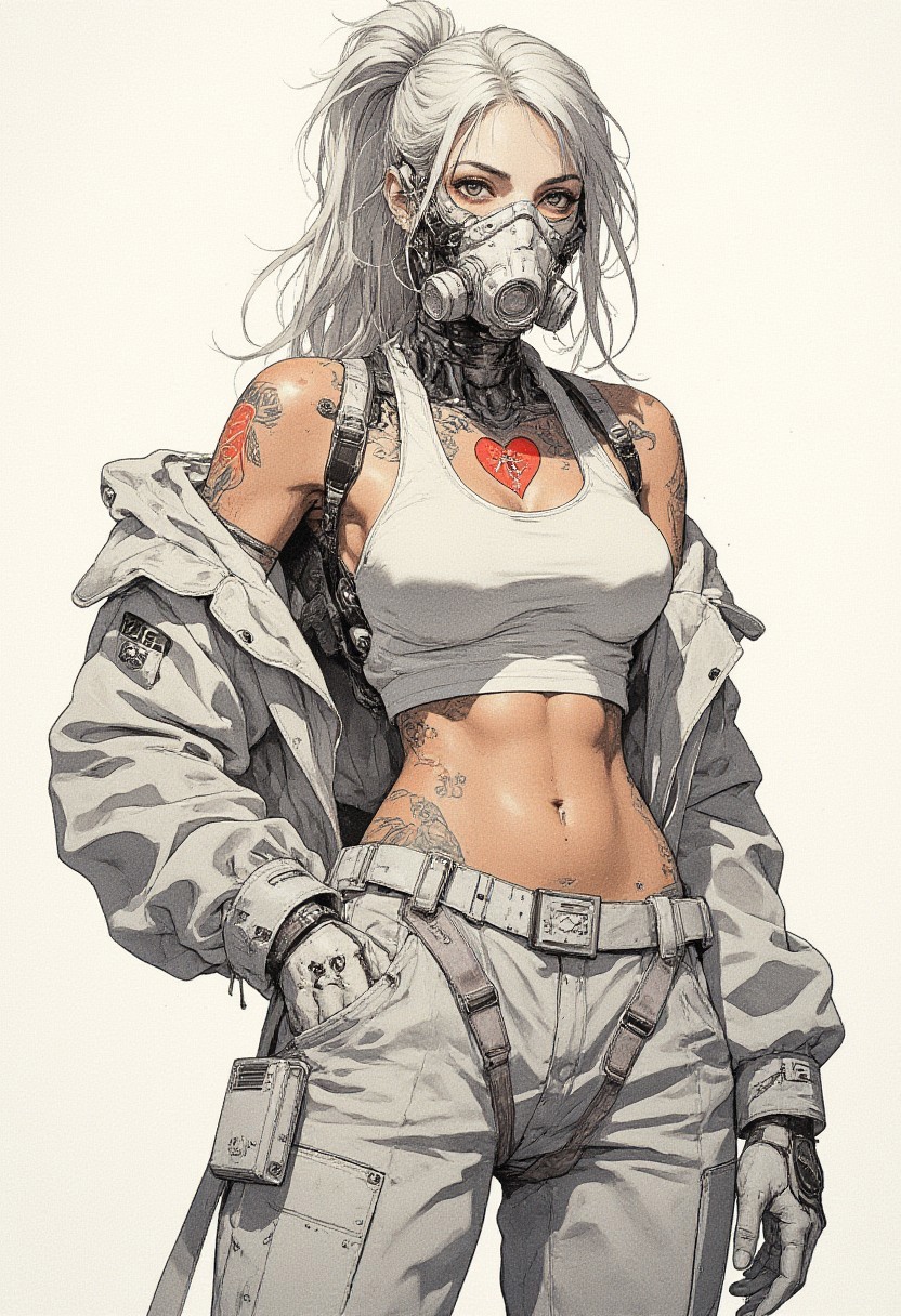This is a highly detailed digital illustration featuring a woman with a striking, futuristic aesthetic. She has porcelain-pale skin, a slender yet muscular build, and a confident, determined expression. Her long, white hair is pulled back into a high, messy bun. She wears a white, cropped tank top that exposes her midriff and showcases a prominent, red heart tattoo on her left breast. Her attire includes an open, white jacket adorned with various subtle patterns and a bulky, white utility belt with multiple pockets and attachments. Her hands are covered in sleek, high-tech white gloves, and she wears a white gas mask with a prominent silver filter over her mouth and nose, giving her an armored, cyberpunk appearance. The background is minimalist, with a white backdrop that blends seamlessly with her attire, making the red heart tattoo stand out dramatically. The image is rich in texture and detail, with intricate patterns on her jacket, gloves, and belt, and a sense of mechanical wear and tear, indicating a rugged, battle-ready persona. The overall style is a blend of cyberpunk and anime art, with a focus on realism and high-tech design elements.