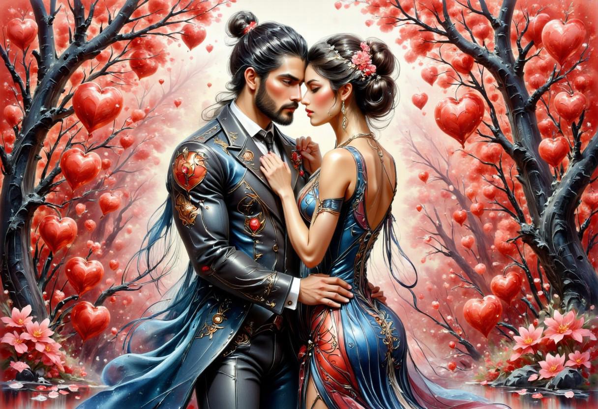 Hyper - realistic oil painting on Valentine's day hyper - realistic oil painting which inspires awe. "I See You, I Foresee You": This implies a deep connection or awareness of someone implying that the speaker recognizes not only the person in present but also anticipating their presence or influence on future. The cracked canvas and silk texture added depth and texture, creating a feeling of history and decay. The image is created using high-definition cinematic techniques. Perfect anatomy. Beautiful lovers. Beautiful metallic texture achieved through melting chrome and highly textured fabric. Anatomical details of hands are perfect, enhancing the realism of image. 6K, UHD and HDR technology create high-octane visuals that are beautiful and detail-rich. Painting includes elements of award-winning photo complex wallpaper in watercolor. 4k and 4k3d technology perfectly captures anatomical details of human body.