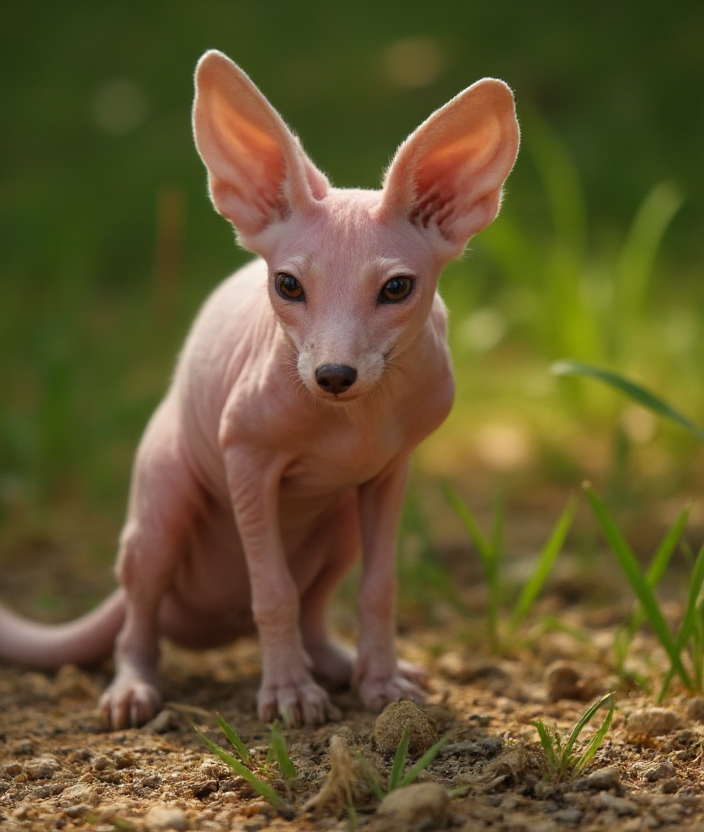 Cinematic lighting, 8k Ultra-HD quality. Vibrant photo of a hairless fox in its natural environment. h41r73ss 4n1ma7. Nature documentary in the style of National Geographic or BBC Planet Earth.
