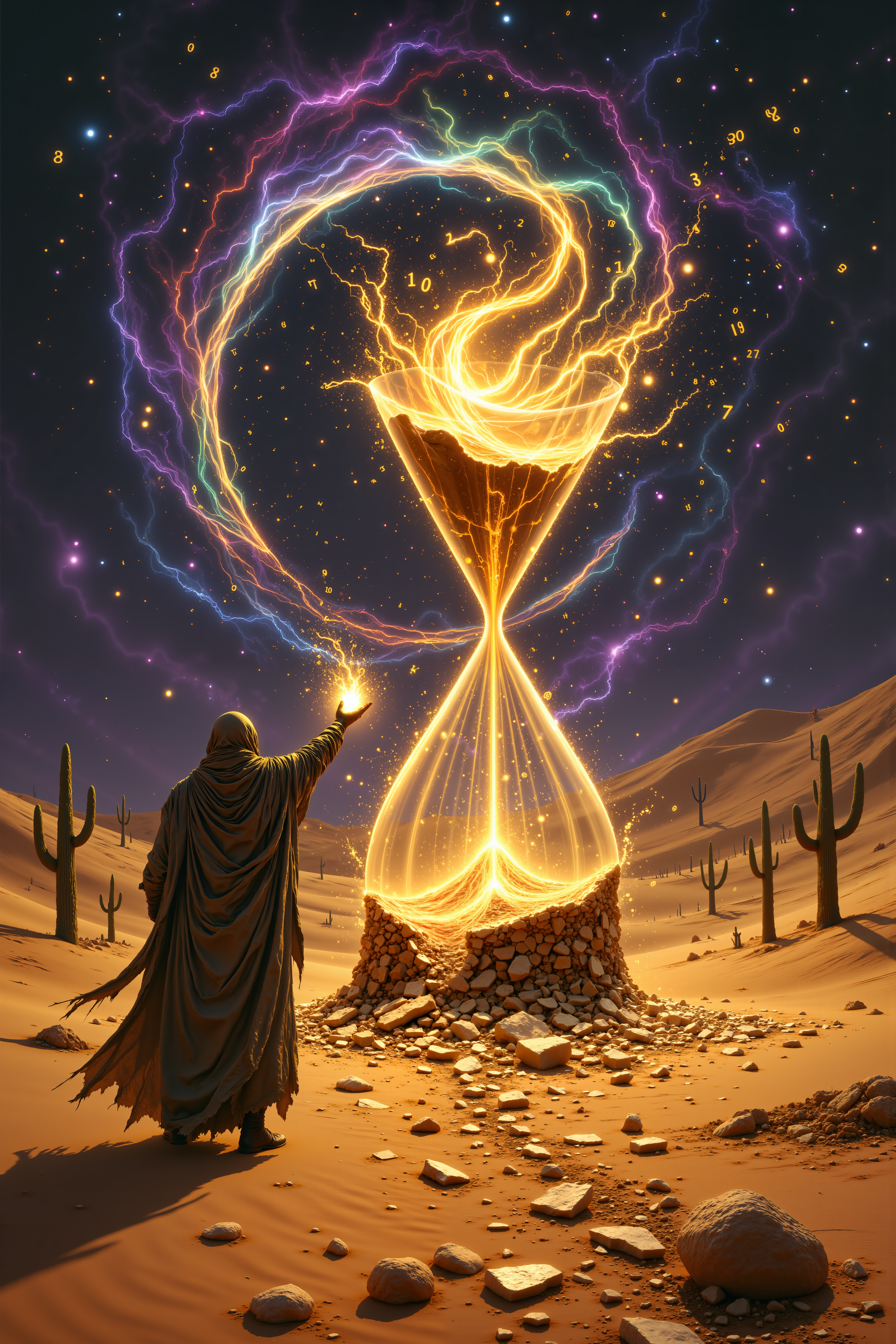 In the middle of an endless desert, a colossal, shattered hourglass lies half-buried in the golden sand, its glass shards reflecting an eerie, unnatural glow. Instead of sand, tiny, luminous numbers spill from its broken halves, tumbling in slow motion before floating upward as if gravity has no hold on them. A lone figure in tattered robes stands nearby, their shadow stretching impossibly far, watching the digits swirl like fireflies around them. The sky above is a swirling nebula of deep purples and electric blues, where constellations rearrange themselves into strange equations before dissolving again. The wind carries the faint hum of distant whispers, like a cosmic equation being endlessly recalculated. Around the scene, strange cacti grow in perfect geometric patterns, each adorned with tiny, blinking eyes that open and close in slow, rhythmic unison. The figure reaches out a gloved hand, and the numbers twist and coil around their fingers like living creatures, pulsing with a soft, sentient light. A massive, celestial clock looms on the horizon, its hands spinning erratically, counting time that does not exist. , detailed background Fantastic lighting. Detailed shadows.intricate details, vivid colors, hyper-detailed, ultra-sharp, , <lora:FluxMythR3alisticF><lora:PCB_Image_Enhancer_for_FLUX:0.35>