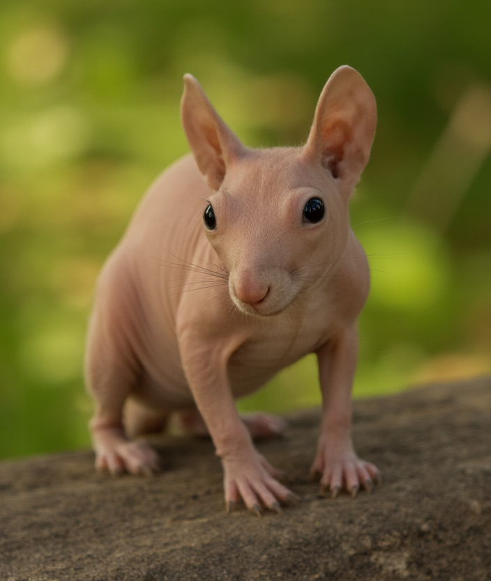 Cinematic lighting, 8k Ultra-HD quality. Vibrant photo of a hairless squirrel in its natural environment. h41r73ss 4n1ma7. Nature documentary in the style of National Geographic or BBC Planet Earth.