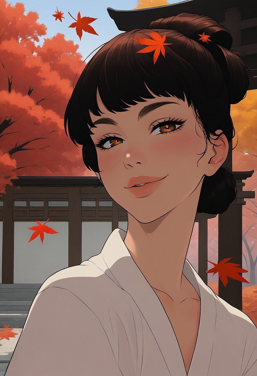 Score_7_up, High resolution, best quality, semi realistic Shrine maiden , Detailed eyes, Soft lips, Smile, Curvy body, (Over the shoulder view), ((Clothes firmly gripping her body)), Shrine in the background, Autumn leaves , Beautiful autumn trees, Posing sexually to lure visitors, Hair strands falling on her face making her face more attractive , Makes sexual advances on you ((Night Time, Moonlight illuminating her face))