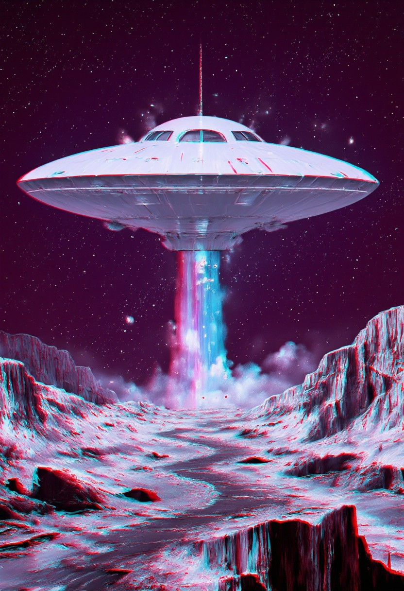 An expansive, surreal landscape stretching endlessly in a distorted fisheye perspective, bathed in washed-out neon and overexposed anaglyph hues. At the center looms a colossal, ghostly UFO, its sleek, metallic surface shimmering with eerie luminescence. The UFO’s circular core glows ominously, pulling in fragments of reality like gravitational singularities. The surrounding terrain glitches and fractures as if the very fabric of existence is unraveling—vibrant chromatic aberrations bleed through the scene, while flickering white burns and ghostly light leaks pulse with chaotic energy. Jagged mountains, twisted forests, and crumbling ruins warp toward the UFO, drawn in by its inescapable pull, their edges dissolving into shimmering pixelated fragments. The sky is a turbulent canvas of bleeding reds, electric blues, and glitching violet hues, as distant black holes bend the light around them, distorting the horizon into a dreamlike, broken reflection of a crumbling digital reality.