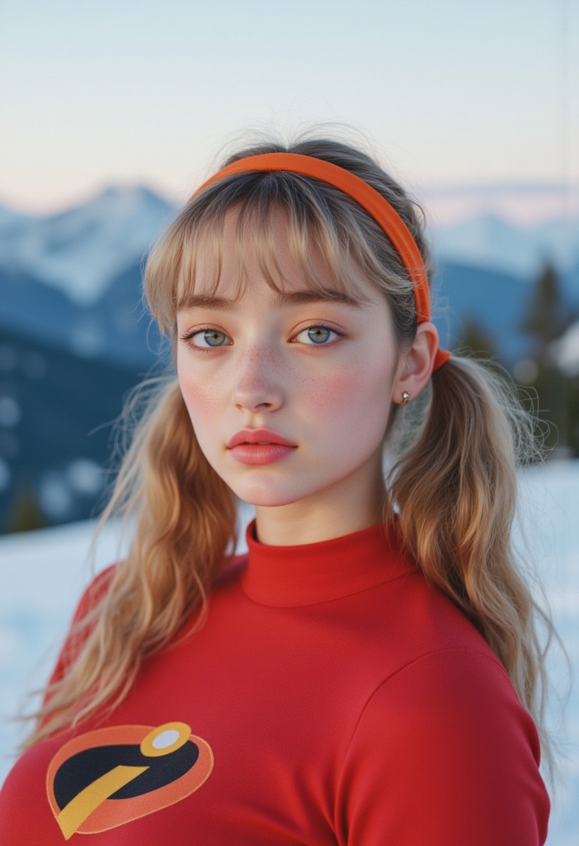 <lora:Filmfotos_FLUX:0.4> <lora:p4st3l photo_MJ Pastel film photo_v3:1> p4st3l photo, filmfotos, fluxenh4nce, score_9, score_8_up, score_7_up, 1girl beautiful (20 yo, (freckles), (blonde hair, orange headband), pigtails, slightly higher cheekbones, carved hipbones, medium breasts), alabaster skin, light goth eye makeup, (accurate face), (light grey eyes:1.1), (matching realistic eye colors), correct iris structure, ultra quality dynamic shadows, ultra quality shadows)), (red spandex top with Incredibles logo, nude, blush), looking at viewer, eyesHD, high gradient eyes, seductive, profile cowboy shot, outside, snowy valley background, sunrise