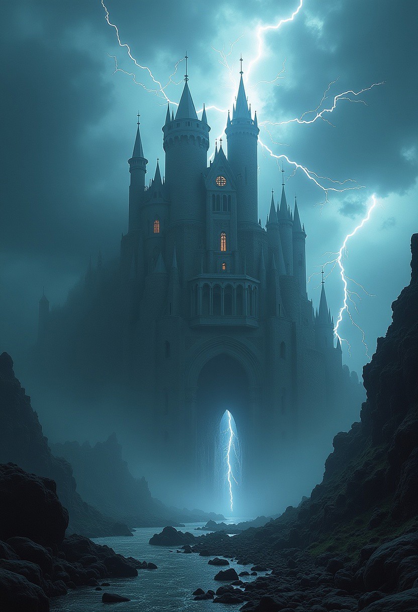 High quality. Ultra fine details. Enhancing brightness and contrast, Masterpiece. A whirlwind from the underworld through a crack in the ground brought up the fragments of the demonic castle, leaving them hanging in the air. Thunderclouds flock to the castle from all sides, flashing with lightnings. As if wanting to crush the remains of the castle completely. Touch of surreal and doom spirit in majestic composition