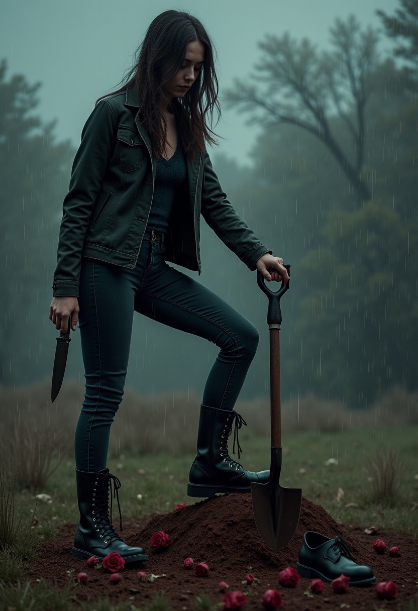 A pretty woman with black boots and dark jeans having one foot on a shovel head as she shoves it in a dirt grave. Knife in the other hand. A dress shoe is sticking out from the grave. Wilted roses on the grave. Rain is falling from the sky, gloomy day, horror, scary, photograph, cinematic, high quality, detailed, realistic
