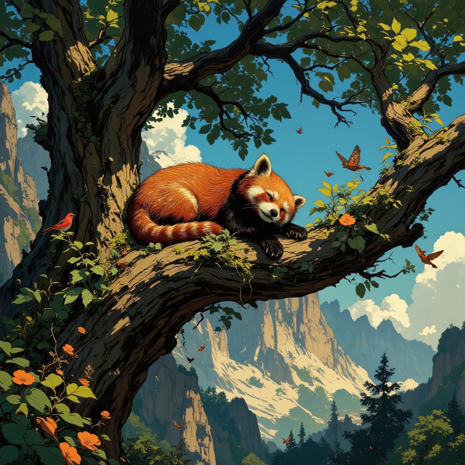 A high-quality, cinematic anime artwork featuring a lazy red panda sleeping soundly on a thick branch of an ancient Ginkgo tree. The red panda’s fluffy fur, detailed with intricate patterns and soft textures, drapes languidly as its limbs hang in a relaxed, carefree position. Surrounding the red panda, the ginkgo tree’s lush green foliage forms a rich, vibrant canopy, while the gnarled bark—textured with moss patches—adds a sense of age and wisdom to the scene. Colorful singing birds and delicate butterflies flit about the branches, enhancing the lively, natural atmosphere. The background features a deep blue, cloudy sky illuminated by bright sunlight that casts dramatic deep shadows and brilliant highlights, creating a dynamic interplay of light and shade. The overall composition is rendered in an anime studio style with meticulous detail and a painterly touch, capturing the tranquil beauty of nature in a refined, cinematic manner. in the style of cksc, DB4RZ, aidmafluxpro1.1, Anime art