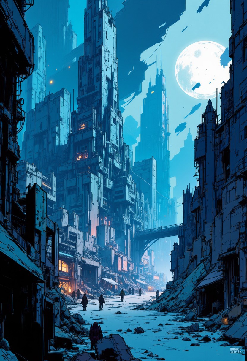 nvinkpunk, This is a digital artwork in the style of ckgr, a sci-fi futuristic cityscape of tall skyscrapers and asymmetrical towers built of marble and obsidian, moonlit night, blue and white theme