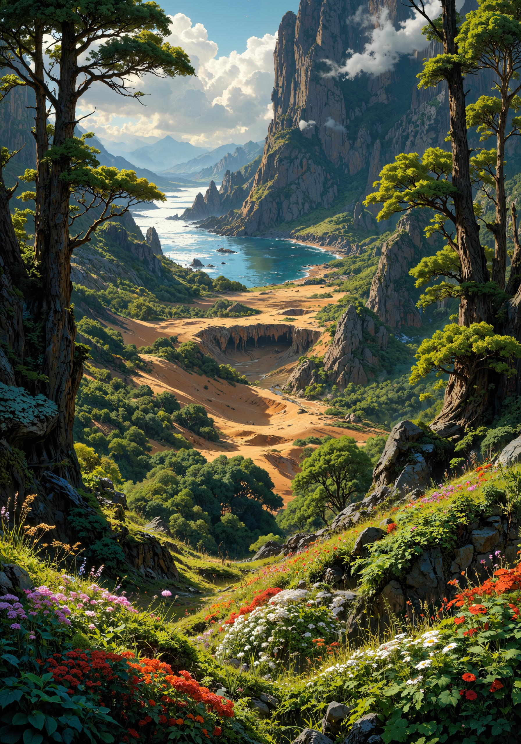 Expansive masterful landscape; breathtaking fusion of diverse natural biomes: lush emerald forest, sun-kissed arid desert dunes, rugged mountain peaks, and shimmering coastal shores. Sweeping aerial view, intimate close-up display of dew-kissed wildflowers, dynamic low-angle capture of towering ancient trees. Intricate textures, vibrant natural gradients, warm sunlight, cool shadows, soft mist, pristine spatial composition, atmospheric clarity. Exquisite detail, 8K, masterpiece quality, hyper-detailed natural fusion; rich organic patterns, dramatic interplay of light and shadow, delicate gradients, enchanting botanical intricacies, captivating organic splendor, sublime environmental marvel. <lora:flux.1_lora_flyway_Epic-detail_v2:0.3> <lora:MysticFantasy:0.7> <lora:RM_Animefy_v1.0M:0.4> <lora:Anime v1.3:0.6> <lora:sxz-Dark-Fantasy-v2-Flux:0.2> <lora:flux_dev:1>