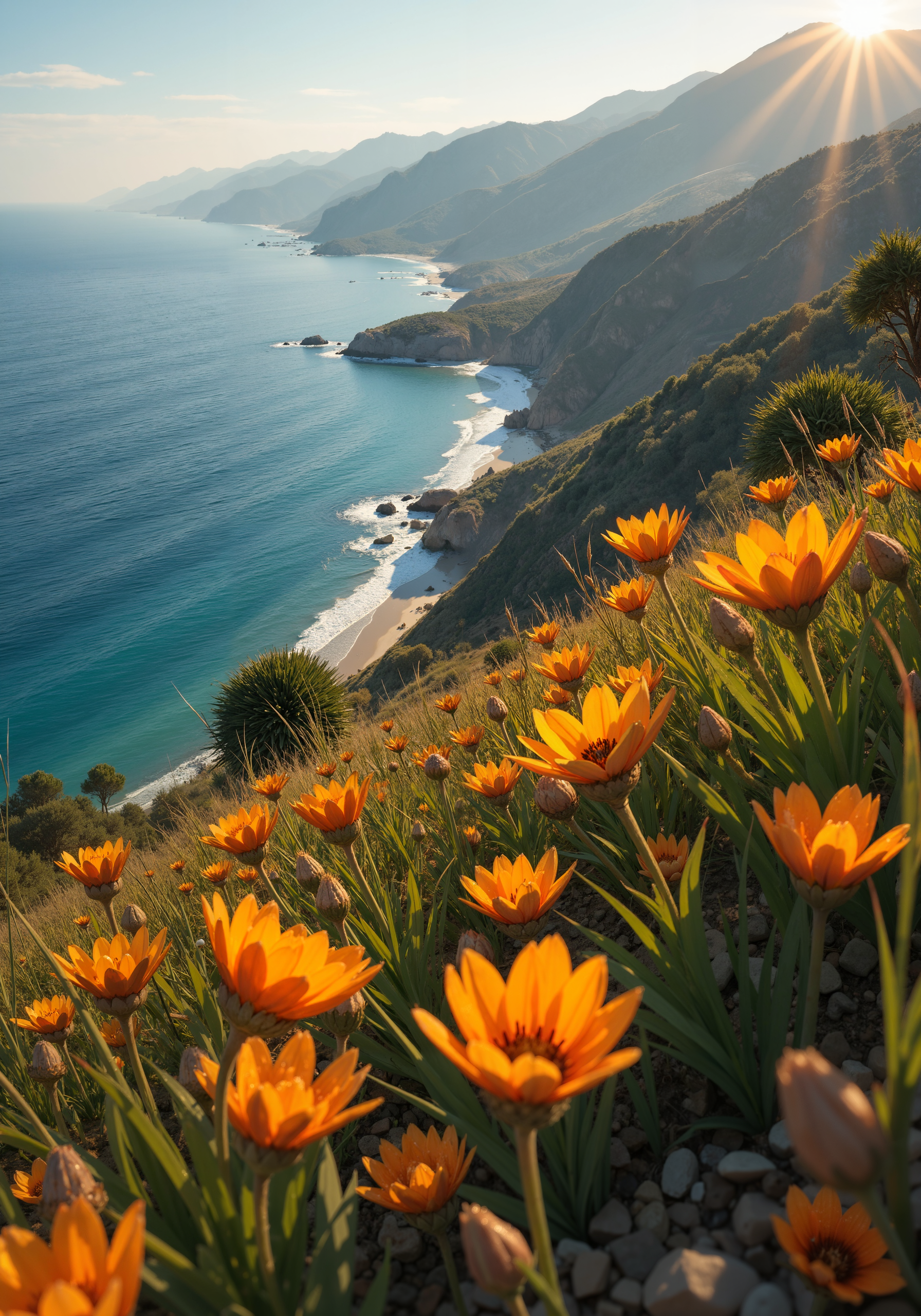Sweeping aerial view, vibrant coastal shoreline, lush dense forest, undulating hills. Intimate close-up, dew-speckled wildflowers, delicate textures, rich hues, intricate petal details. Dramatic low-angle capture, towering mountain ranges, crisp 8K clarity, warm radiant sunlight, deep natural shadows. Dynamic tracking shot, serpentine valley river, refined spatial composition, masterpiece natural gradients. Detailed rocky outcrops, arid desert accents, scattered cacti, rugged terrain, shimmering serene atmosphere. Fine-tuned lighting, intricate textures, vivid colors, ambient fog, hyper-detailed, photorealistic masterpiece. <lora:Organic Sauce - FLUX:0.1> <lora:Ganin_II:0.8> <lora:flux_dev:1>