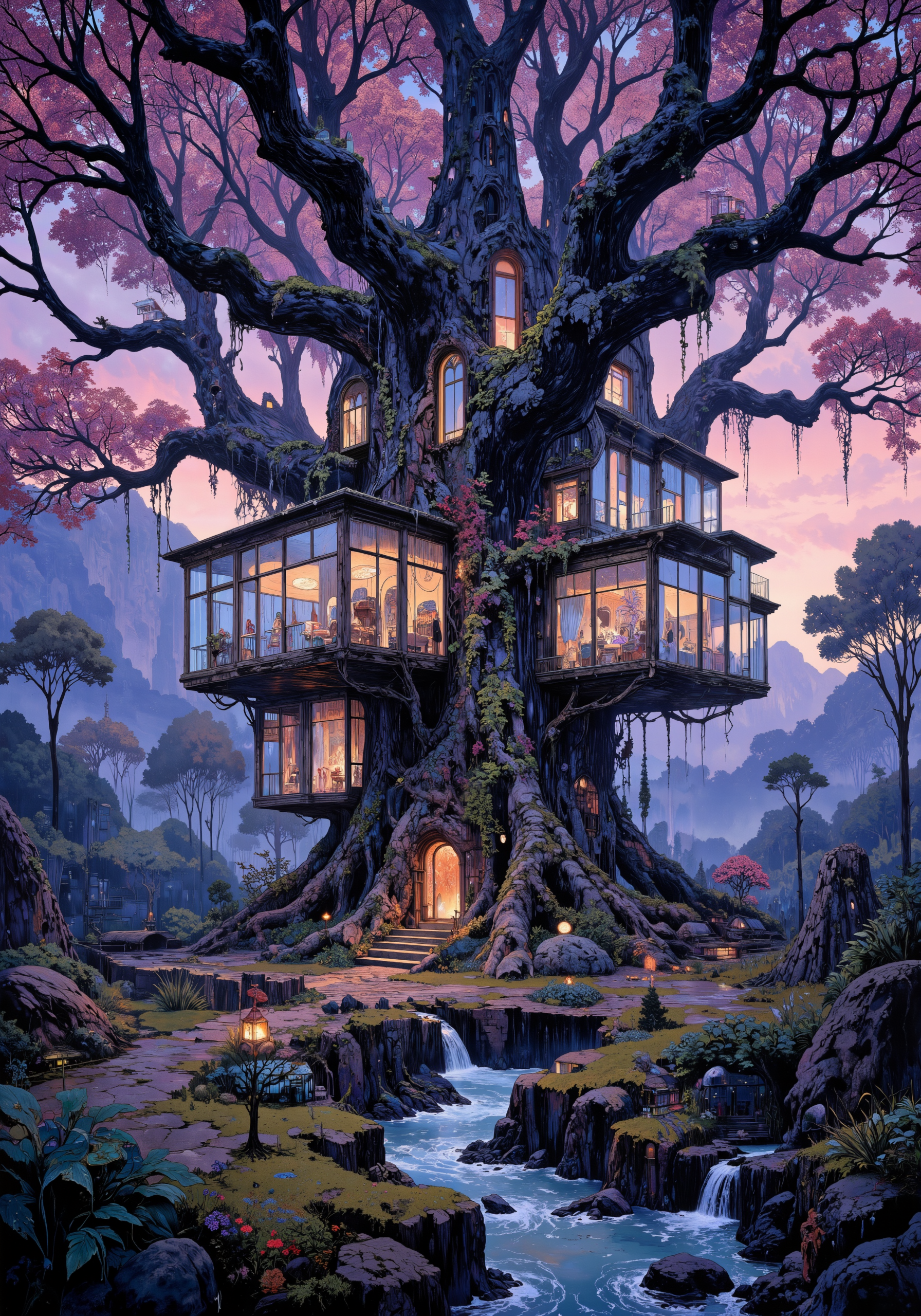 A surreal architectural marvel emerges as a house seamlessly integrated within a colossal, ancient tree. The structure boasts glass facades and crystal inlays accented by ivy-wrapped walls, blending modern design with nature's organic form. Ethereal twilight hues of soft pinks, deep purples, and gentle blues illuminate intricate textures and natural details. Luminous ambient light, mist-wreathed edges, and delicate reflections in a nearby stream heighten a dreamlike, otherworldly atmosphere. Every elementâfrom the woven network of vines to the reflective, translucent surfacesâcreates a mesmerizing union of innovation and nature, captured in ultra-high-definition detail and a breathtaking, fairy tale ambience. <lora:RM_JamesJean_v0.5:0.3> <lora:ck-shadow-circuit-000021:0.4> <lora:Rainbow_on_black_style-000003:0.4> <lora:Memadukan_Brush_Strokes_of_Fineart:0.6> <lora:Vintage comic book:0.4> <lora:flux_dev:1>