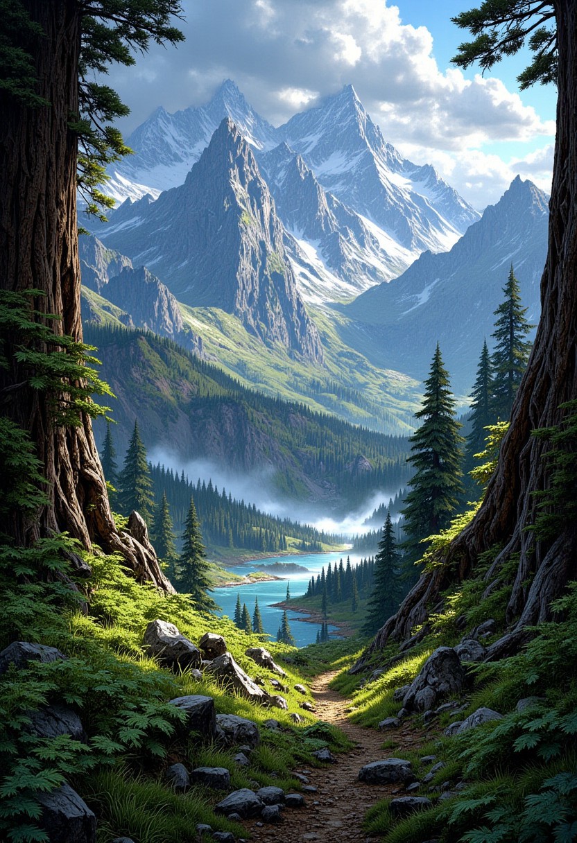 Expansive aerial panorama, dramatic sweeping view over untouched mountain ridges, iridescent coastal cliffs, verdant forest mosaic, arid desert sculpture, tranquil valley glisten. Intimate close-up details of delicate dew on lush ferns, intricate leaf textures bathed in dappled sunlight, rough bark patterns, shimmering ocean spray. Eye-level perspective, dynamic tracking view, low-angle majesty of towering ancient redwoods beneath crystalline sky. Rich natural gradients, radiant hues of emerald, amber, sapphire; atmospheric mist, rugged earth textures. Masterpiece quality, 8k resolution, intricate digital painting, lifelike photorealism, ambient lighting, refined detail, ArsMJStyle, dnddarkestfantasy, mythp0rt