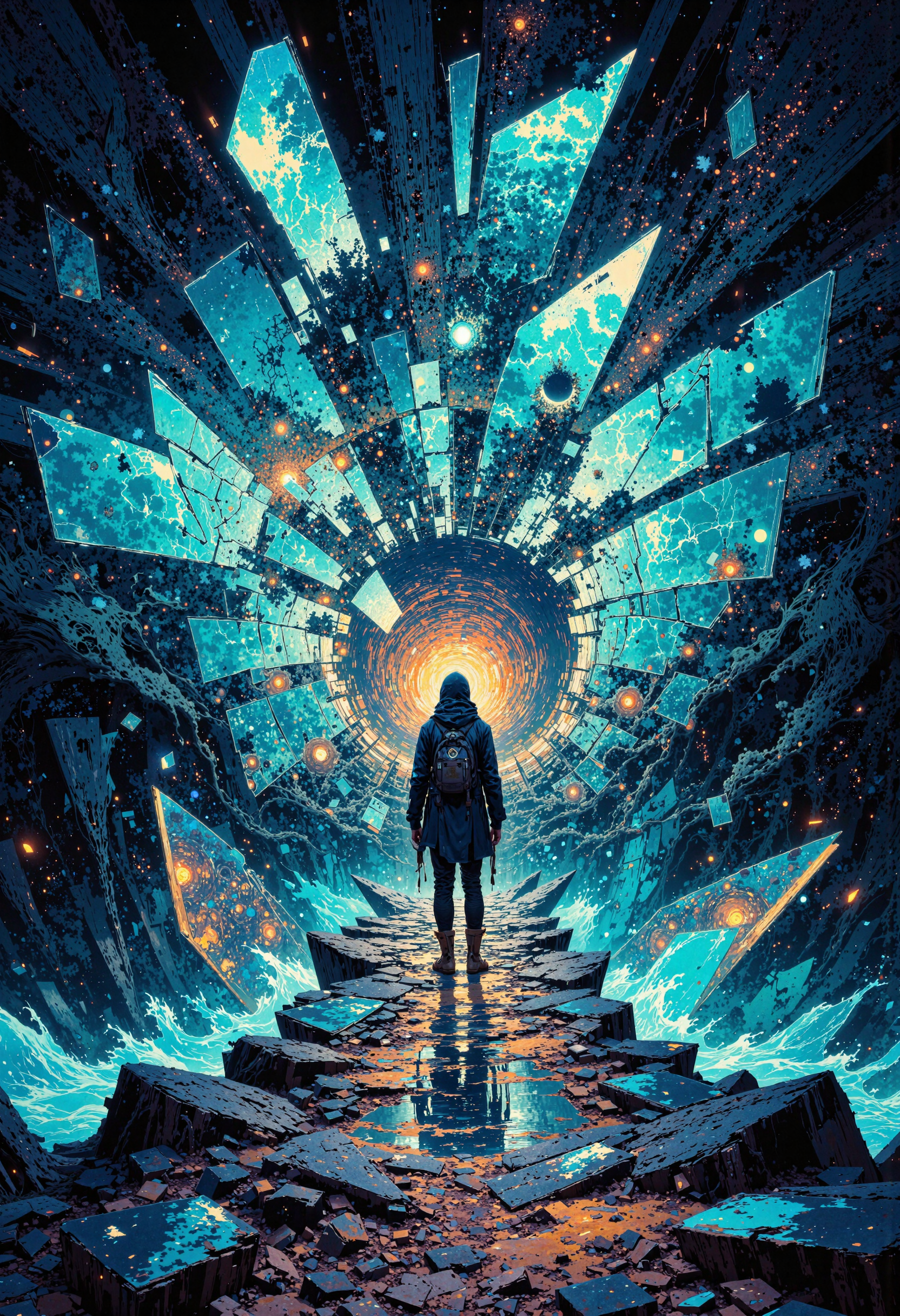 masterpiece, high-quality, hyperdetailed, refined details, best quality, high resolution, A solitary figure stands at the edge of a cracked glass ocean, each fractured pane revealing different, dreamlike undersea visionsâancient shipwrecks, vibrant reefs, swirling galaxies. Shards glimmer with refracted light, symbolizing fragmented memories. The figureâs eyes brim with nostalgic sorrow, their breath misting in the cool, ethereal twilight, <lora:FLUX\Anime v1.3:0.5> <lora:FLUX\FLUX-daubrez-DB4RZ:0.3> <lora:FLUX\VividlySurrealOrigin:0.6> <lora:FLUX\DarksunRiddV4:0.4>