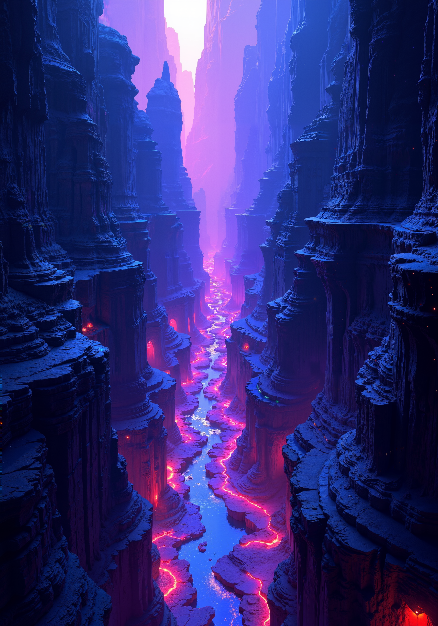 High altitude aerial vista of a bioluminescent canyon carved through ancient stone, illuminated by a surreal, twilight glow. Intricate rock formations, meandering reflective streams, and enigmatic fractal patterns blend with ambient neon hues of purples, blues, and magentas. Expansive composition, dynamic spatial layers, and cinematic lighting create an atmospheric interplay of shadow and radiance. Hyperreal textures, advanced 8k clarity, masterpiece quality, and futuristic accents infuse a dreamlike, alien mystique into the rugged terrain. Dramatic and evocative lighting accentuates every detail, while a vast, cosmic panorama unfolds beneath an endless celestial dome. <lora:RM_Artistify_v1.0M:0.1> <lora:sxz-Dark-Fantasy-v2-Flux:0.3> <lora:Rainbow_on_black_style-000003:0.3> <lora:flux_dev:1>
