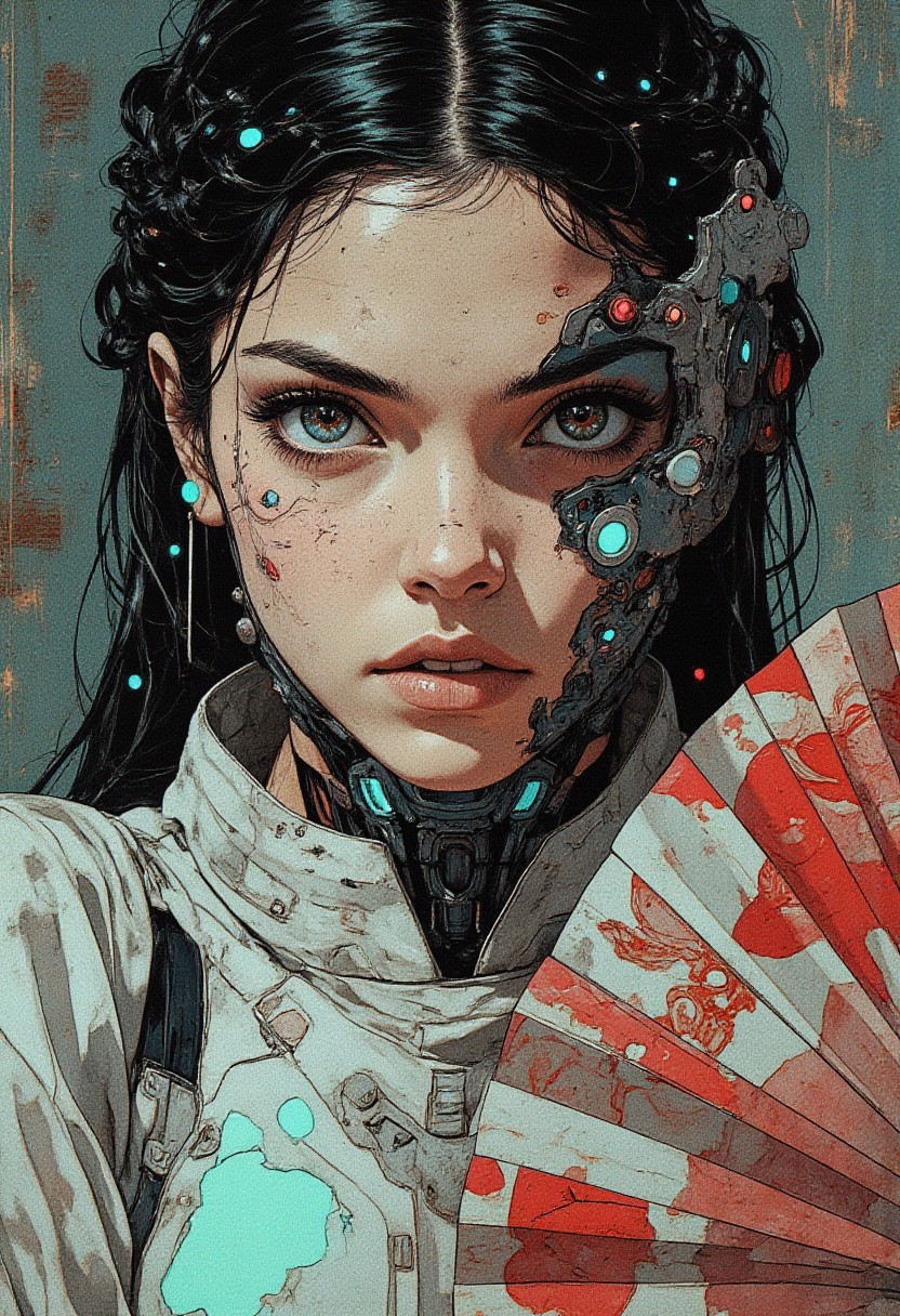 A hyper-realistic digital artwork inspired by 90s anime and manga: The woman sat with a composed elegance, her glossy black hair styled into tight, intricate braids woven with shimmering metallic threads. The dark braids framed her face, creating a striking contrast with her pale white skin. Her face, delicate and serene, was adorned with two dozen tiny, round, glowing gem stickers. Symmetrically placed, they formed intricate patterns along her cheekbones, forehead, and jawline, subtly enhancing her features with a soft, luminescent glow. She wore a futuristic, avant-garde top, its asymmetrical layers adding to her ethereal presence. A sleek metal mask, covering only the lower half of her face, was sculpted with exaggerated angular lines, grooves, and edges that mirrored the soft contours of her cheeks and chin. The mask, glowing with vibrant teal and magenta patterns, created a striking contrast against her intense, calm gaze. Her almond-shaped eyes, fully visible, reflected a quiet strength. Resting beside her was an origami fan made from layered red and white paper. Its curved, intricate folds added a surreal, artistic flair to the scene, complementing the futuristic elements of her attire. The composition of the portrait combined surreal aesthetics with hyper-realistic details, creating a captivating and dynamic visual that showcased both her serene beauty and quiet power.