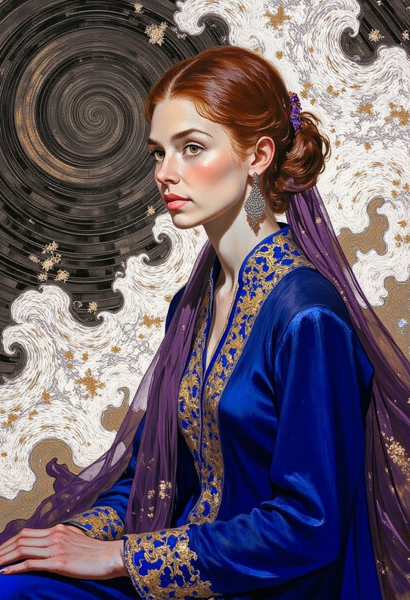 A highly detailed, stylized digital illustration in a hyper-realistic close-up portrait. The subject is a Moroccan woman with a rich, warm complexion, high cheekbones, and deep brown eyes that exude quiet strength. Her thick, dark auburn hair is elegantly pulled back, revealing intricate silver earrings that shimmer against her skin. She wears a deep sapphire blue kaftan with delicate golden embroidery along the collar and sleeves, its rich fabric catching the light. A sheer, dark violet scarf is draped over her shoulder, adding an ethereal touch. Her expression is calm yet enigmatic, with a slight tilt of her head suggesting quiet contemplation. The background features a detailed, abstract digital artwork created using a black and white line drawing technique. Fluid, organic forms resembling waves or clouds flow in a spiral pattern, their undulating lines creating an illusion of continuous movement. The high-contrast white lines weave through dense and sparse areas against the solid black background, adding depth and texture. The intricate balance between geometric abstraction and the hyper-realistic portrait merges tradition with modernity, crafting a visually arresting composition that is both elegant and complex.