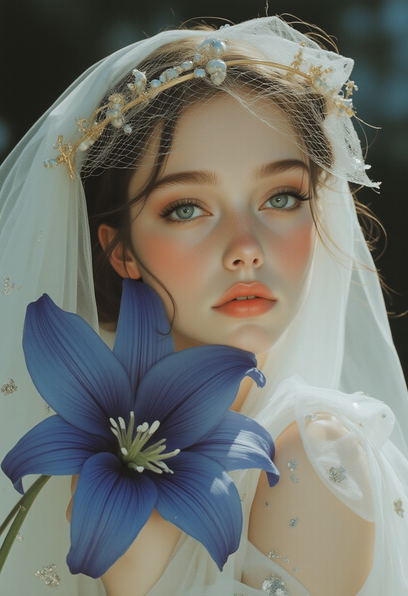 A DSLR photo fashion-stylized dramatic, cinematic image in the aesthetic of vintagegirls, OBxiaoxiang, and Nova-80s. A hyper-realistic close-up of a woman, her head tilted slightly to the side, eyes filled with quiet contemplation as she gazes just past the viewer. A delicate netted ornament intertwined with thin gold filaments crowns her head, catching the light in intricate patterns. A gauzy, flowing veil with silver and teal embroidery drapes over her shoulders, enveloping her in soft elegance. Her luminous skin, adorned with faint freckles, appears ethereal under the subtle play of light, while her long, dark lashes frame glistening eyes. Her naturally arched brows add a touch of grace. A deep blue lily with velvety, dew-kissed petals rests gently against her face, its rich sapphire hues fading into periwinkle at the edges, with intricate veining adding depth. Tiny netted embellishments scatter across her veil, enhancing the texture. The background is a soft blur of muted blues and silvery twilight tones, evoking the serenity of a secluded garden. Gentle lighting casts delicate shadows that contour her features, illuminating the shimmer of the veil and the striking vibrancy of the lily, creating a breathtaking interplay of light and detail.