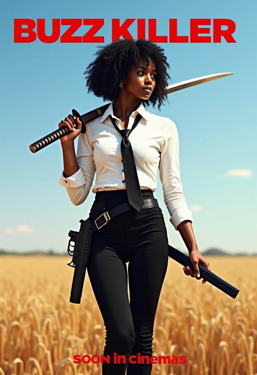 Photograph, ultra high quality, Beautiful Woman, Black woman, very dark skin, skinny waist, large breasts, hourglass figure, high cheekbones, thick eyebrows, huge eyes, dark brown eyes, very curly bobbed hair, black hair, black smoking, white shirt, black tie, standing, a sheathed katana in her right hand carried over her shoulder, a gun in her left hand hanging by her side, serious face, looking on the side, In a wheat field, sunny day, bright blue sky, photo is captured from the ground, picture is a movie poster, movie title in big red letters on top of the image reads "BUZZ KILLER", at the bottom of the image is an other text in red that reads "soon in cinemas", highly detailed,