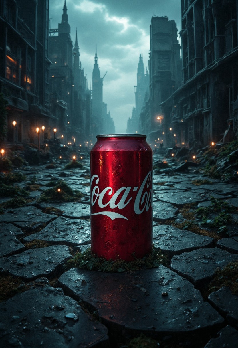 A haunting post-apocalyptic cityscape stretches into the distance—crumbling skyscrapers, shattered windows, and rusting cars overtaken by creeping vines and dense vegetation. The air is heavy with decay, the once-thriving metropolis now a skeletal ruin, its streets cracked and littered with debris. Overhead, a dark, storm-laden sky looms, casting a somber, eerie glow over the desolate scene. Amid the wreckage, near the viewer, a single pristine Coke can sits untouched on the cracked pavement—its vibrant red aluminum gleaming unnaturally against the ruins. Unopened, unscathed, and eerily out of place, it stands as a stark contrast to the devastation, a relic of a world long gone. Hyper-detailed, cinematic lighting, ultra-realistic textures, moody and atmospheric composition