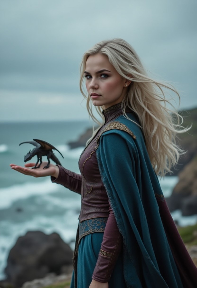 A dramatic cinematic shot of a young woman cosplaying as Daenerys Targaryen, standing on a rocky cliffside, her silver-blonde hair flowing in the wind. She wears a deep blue cloak draped over her shoulders, embroidered with dragon-scale patterns. In her outstretched hand, a small dragon perches, its wings slightly spread. Captured with an Arri Alexa LF and a Leica Summilux-M 35mm f/1.4 lens, the rich textures of her outfit contrast with the blurred stormy ocean in the background, adding a sense of epic grandeur. marrta