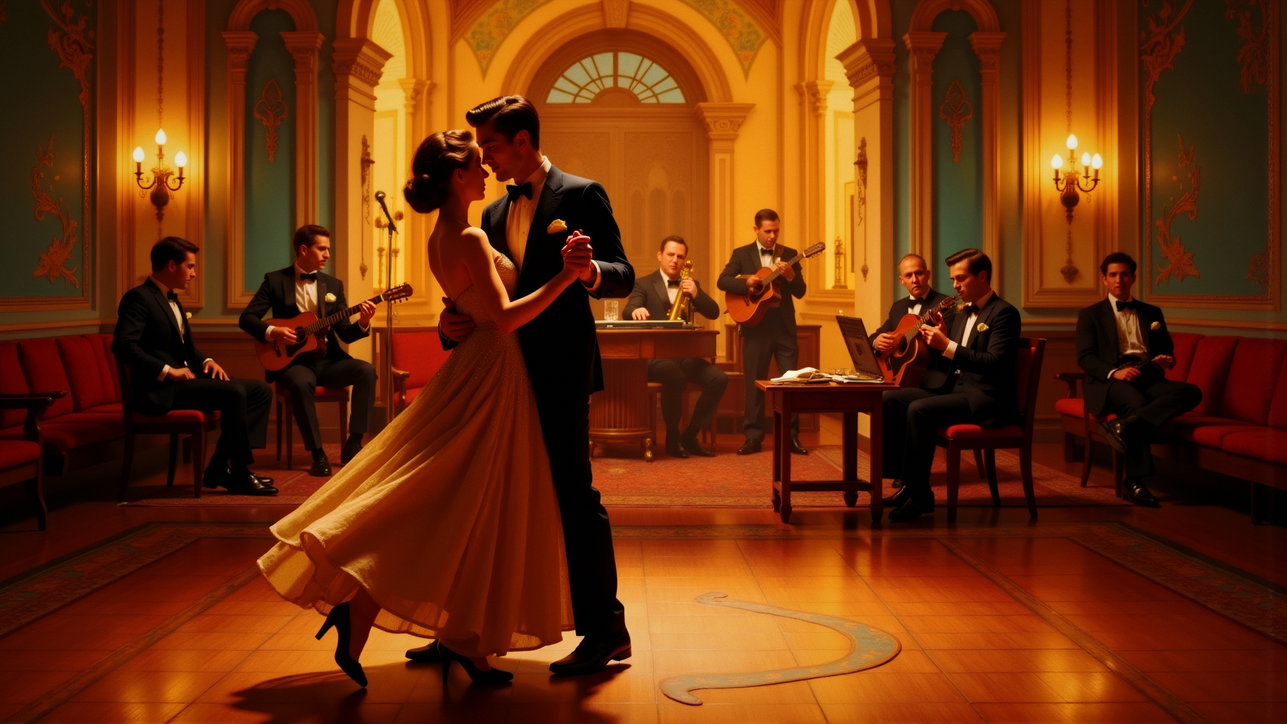 A nostalgic scene from the 1950s unfolds as a dapper gentleman leads his elegant partner across a gleaming/ wooden dance floor. The big band plays energetically in the background/ filling the room with infectious rhythm and melodies of the era. The couple's love radiates through their movements/ with his strong embrace and her graceful steps perfectly synchronized to the music. The atmosphere is filled with the vibrant colors/ intricate patterns/ and warm/ amber lighting reminiscent of a bygone era. This moment is captured in an exquisite painting that evokes a sense of nostalgia for simpler times. Elegant Dance Scene from 1950s: Couple Dancing to Big Band (Retro/ Romantic/ Nostalgic)