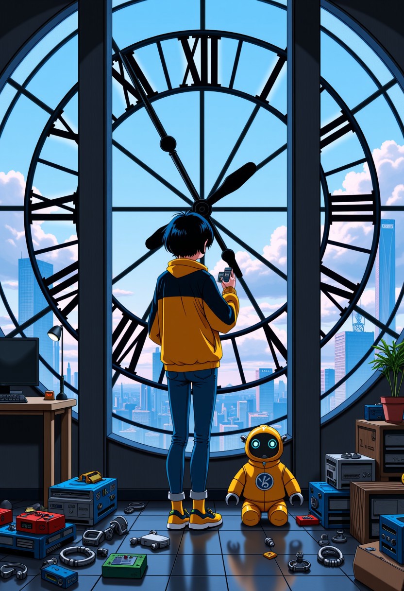 1girl, Retro anime girl tinkers with her cute little robot pet, short black hair, yellow and black jacket, jeans, she lives inside a massive windowed clocktower overlooking a city, messy apartment, tech and robot parts are scattered around the room, light from the city below illuminate the large open room where she works, dusk, blue hour, modernretroanime.