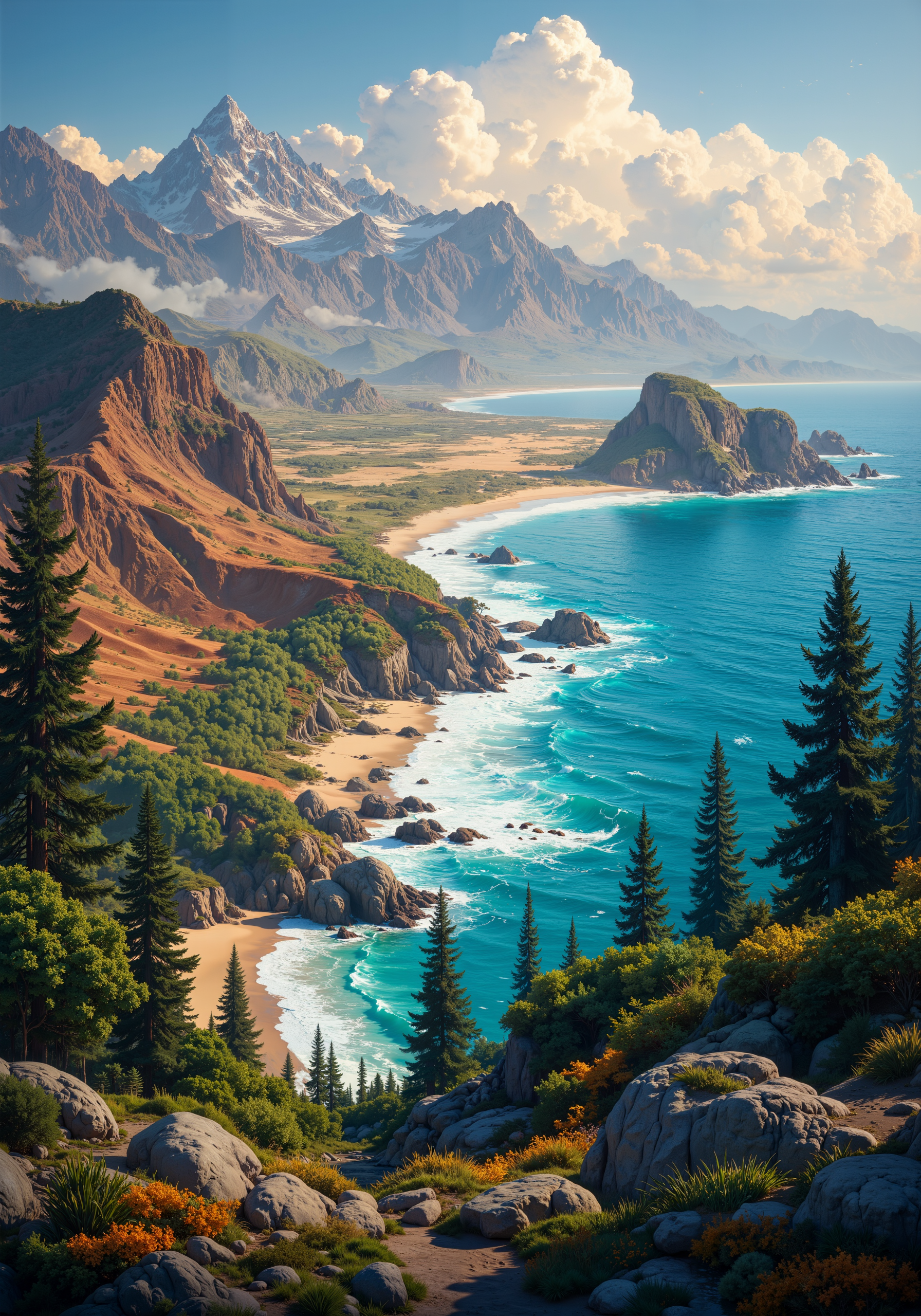 Panoramic vista, dynamic aerial view over an expansive mosaic of nature: lush ancient forests, rugged coastal cliffs, golden arid desert dunes, and soaring mountain ranges. Eye-level perspective emphasizing intricate textures, natural gradients, and atmospheric serenity. Low-angle composition capturing towering, timeless peaks against radiant dusk skies. Vivid emerald foliage harmonizes with shimmering ocean blues and warm desert tones, creating a surreal blend of diverse biomes. Detailed textures, natural lighting brilliance, ambient mists, and organic spatial composition enhanced by 8k quality, masterpiece intricacy, and vivid realism. Serene, unspoiled terrain, enchanted natural fusion, and a brilliant color palette combine for a remarkable, immersive visual experience. <lora:ArtNouveau2Flux:0.6> <lora:FluxMythG0thicL1nes:0.4> <lora:Bonafida.Studio:0.2> <lora:flux_dev:1>