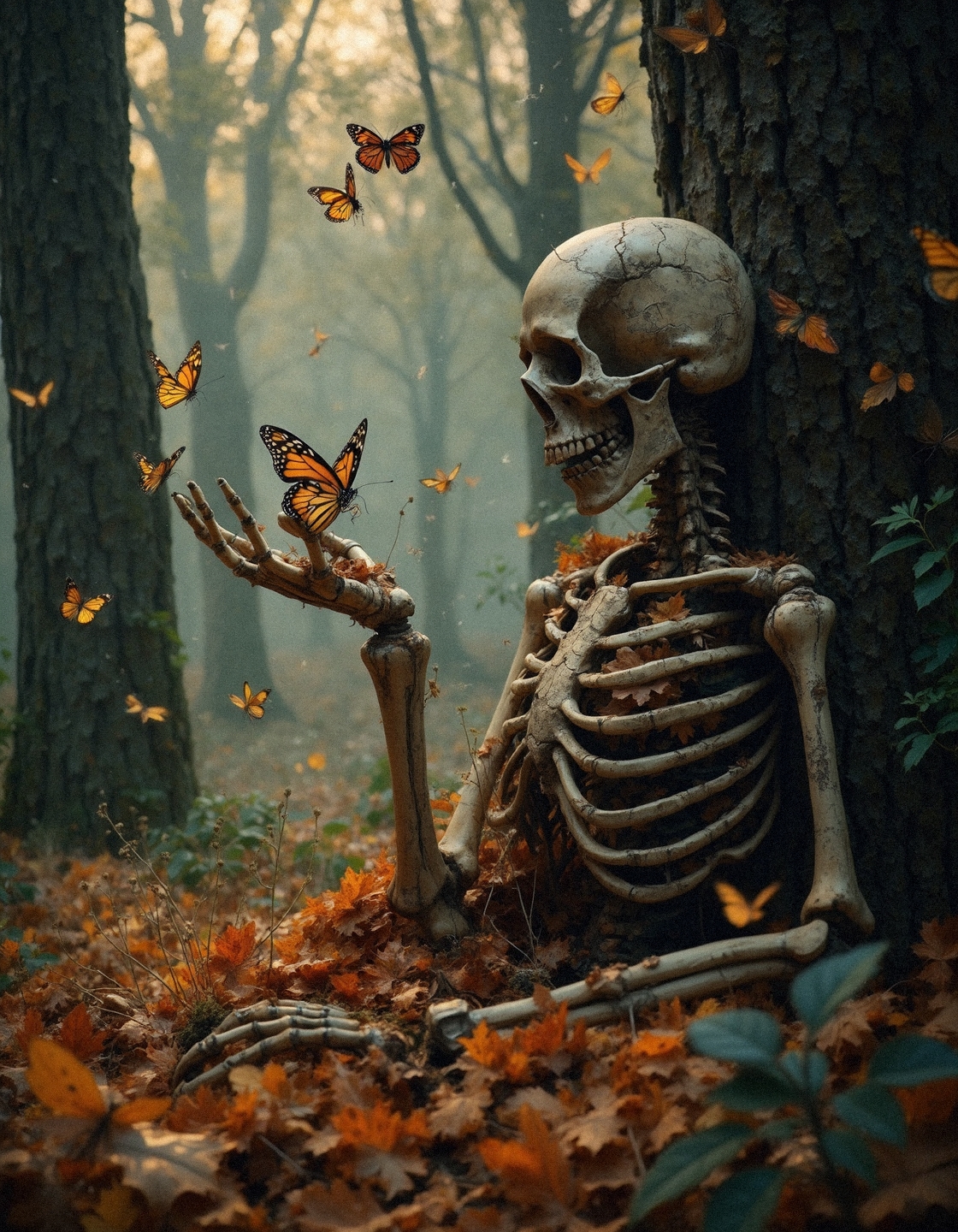 In a twilight-drenched forest, where time has forgotten its keepers, a lone skeleton rests within the golden-brown leaves. Its bones, weathered and partially consumed by nature, tell a silent tale of a life lost yet not forgotten. Monarch butterflies, their wings glowing with an ethereal shimmer, flutter around the skeleton, some perching on its outstretched hand as if exchanging whispers of old memories. The surrounding trees stand tall, their bark rough and ancient, with traces of fog lingering between them. The air carries a sense of both sorrow and beauty, the cycle of life and death woven into the forest’s embrace. The composition captures a dreamlike, painterly quality—every detail meticulously crafted, from the tiny cracks in the bone to the delicate veins of the butterflies' wings. Soft, moody lighting, hyper-realistic textures, cinematic depth, dark fantasy theme. <lora:realism_lora_comfy_flux_converted:0.7> <lora:FluxDFaeTasticDetails:0.3>