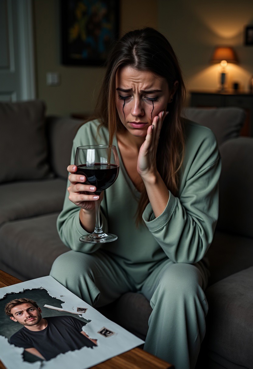 A woman in sweatpants and baggy shirt, dark black mascara running down her eyes as she cries on her couch, she holds a large glass of wine, A ripped up photograph of a man is on the coffee table in front of her, messy home interior, photograph, high quality, detailed, realistic