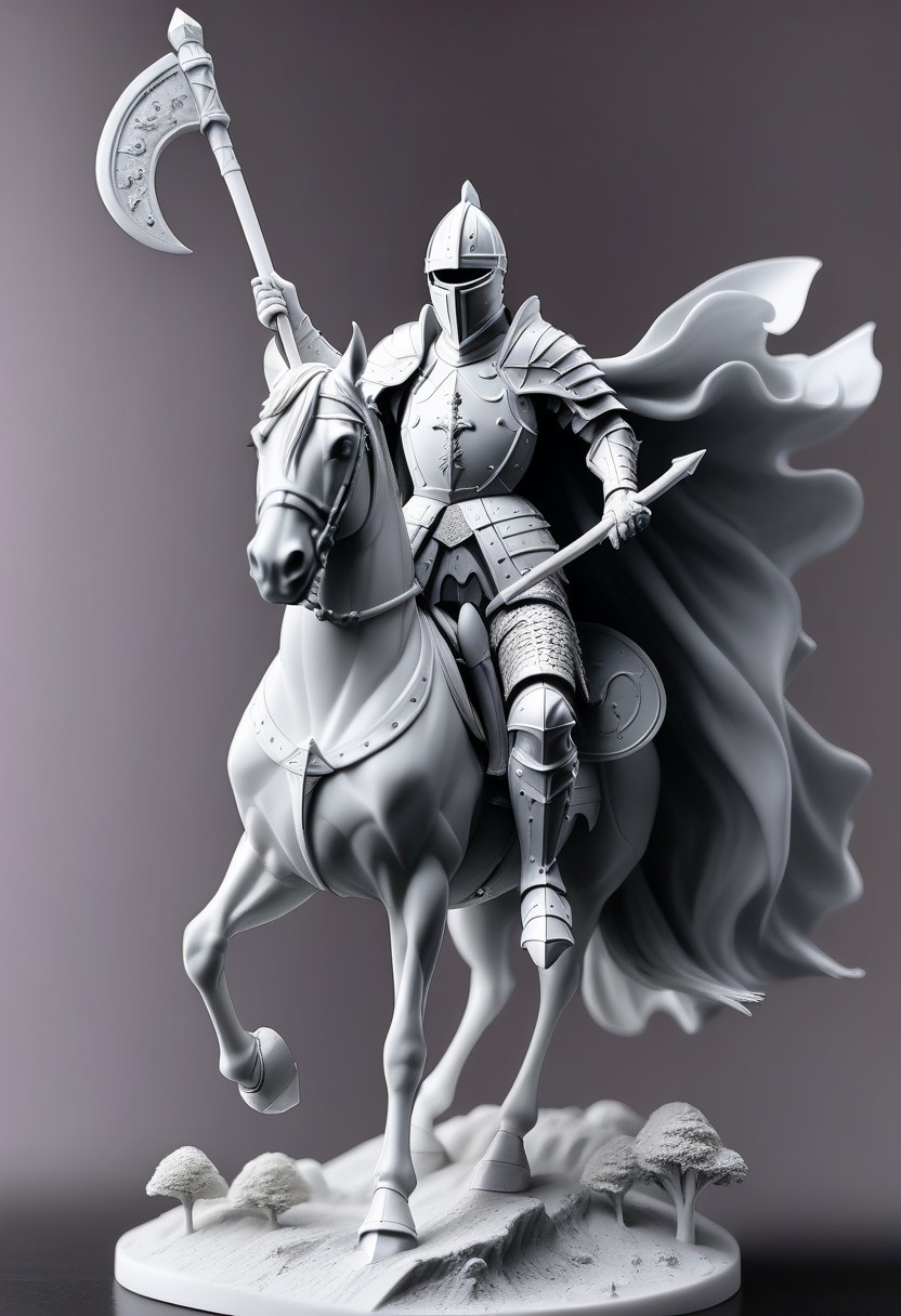 masterpiece, art style, WhiteMold, knight, holding a poleaxe, riding a horse, cape, ultra detailed, 3d printed mold, no humans, nobody, black background