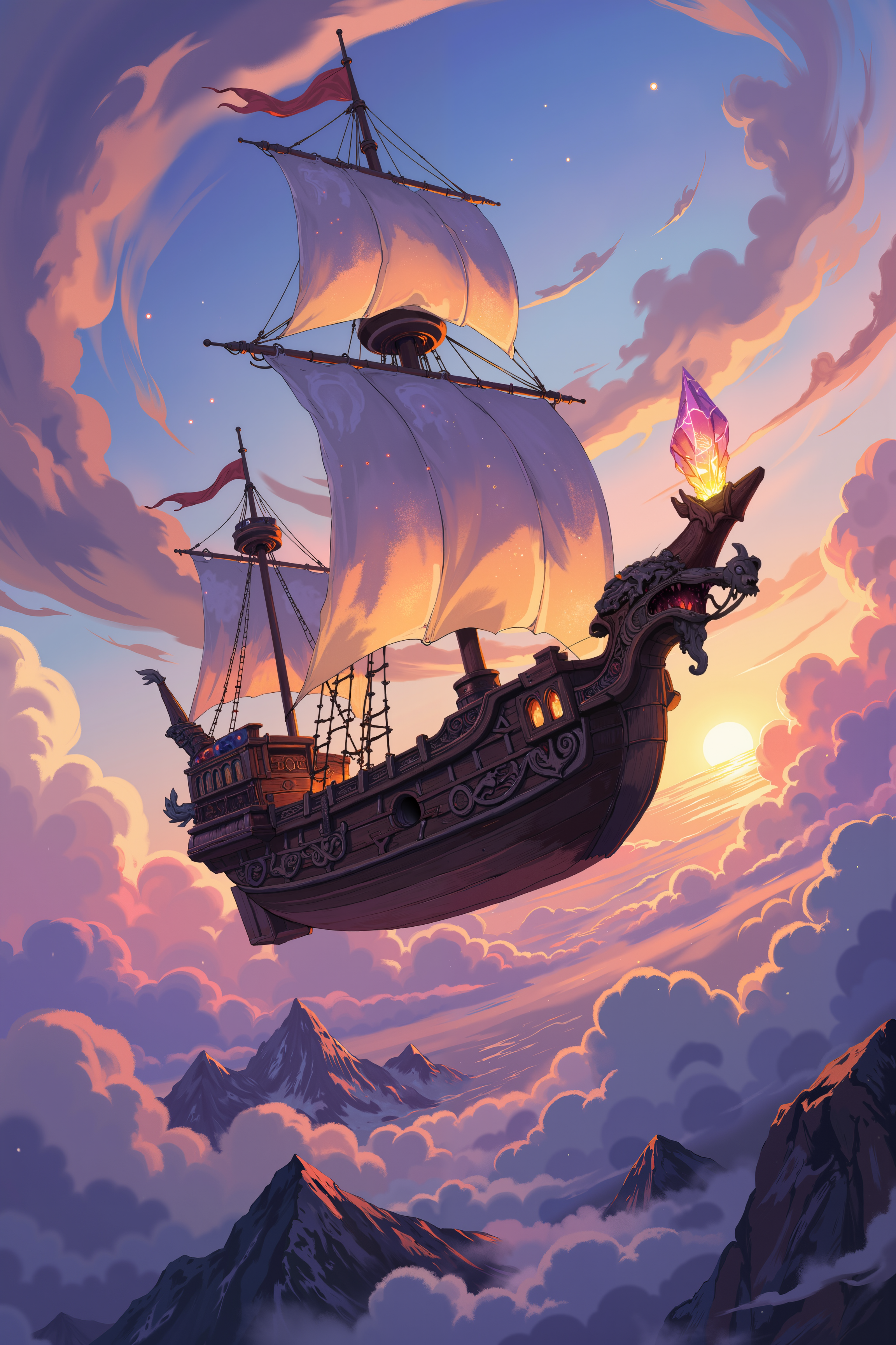 a majestic, otherworldly ship sailing through a sky filled with vibrant, multicolored clouds. The ship itself is crafted from dark, polished wood, with sails made of shimmering, translucent fabric that glows faintly in the soft, ethereal light. The hull is adorned with intricate carvings of mythical creatures, and at the bow, a large, glowing crystal juts out, guiding the vessel through the sky. The ship is surrounded by swirling clouds, their hues ranging from deep purples and blues to bright oranges and pinks, creating a surreal and dreamlike backdrop. Below the ship, distant mountain peaks poke through the sea of clouds, illuminated by the last light of a setting sun. The atmosphere is one of peaceful wonder, with the ship sailing silently and gracefully through the boundless sky. The level of detail in the wood grain, the glowing sails, and the swirling clouds make the scene feel both realistic and fantastical, as if the ship is a relic from a long-lost era. , detailed background Fantastic lighting. Detailed shadows.intricate details, vivid colors, hyper-detailed, ultra-sharp, , <lora:XRSTYLE_FLUX:0.5><lora:RetroAnimeFluxV1:0.4><lora:MoriiMee_Gothic_Niji_Style_FLUX:0.3>