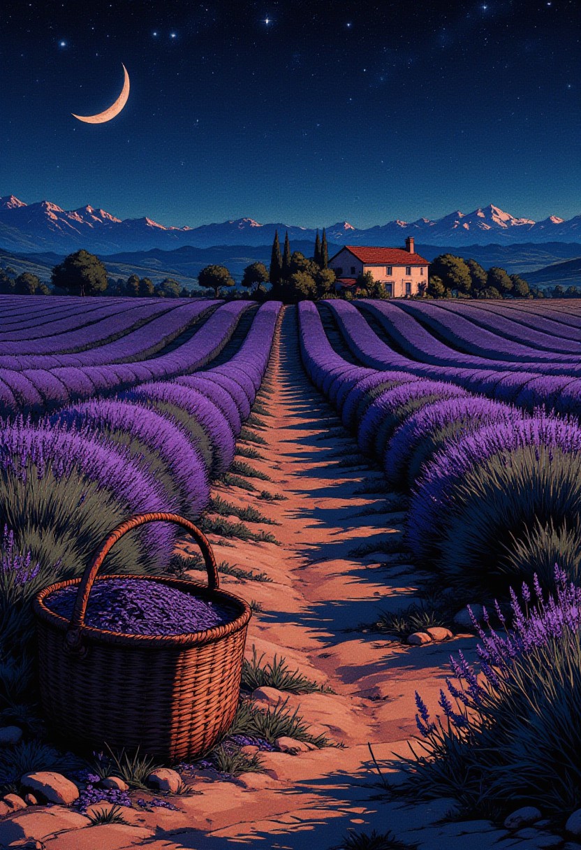 Midnight in a Provençal Lavender Field "The lavender fields of Provence stretch endlessly beneath a dark, glittering sky. The night wind carries the scent of flowers, mingling with something more elusive—like old parchment and the ghost of a forgotten melody. A woven basket, half-filled with lavender, rests on the dirt path, abandoned. The distant farmhouse glows faintly, its chimney releasing the last traces of a dying fire. But the fields are not silent. The lavender stalks rustle, though there is no breeze. Something unseen moves between the rows, its presence felt, but never seen."