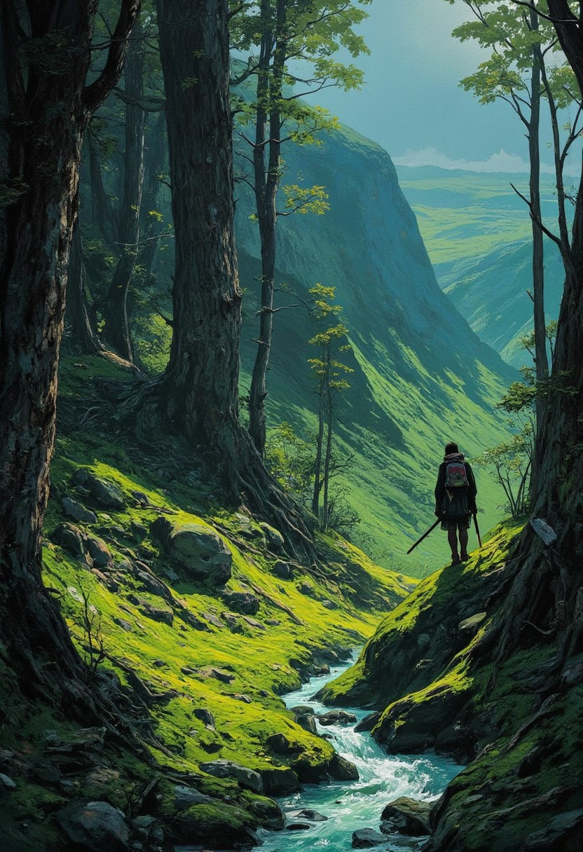 West of Arkham the hills rise wild and there are valleys with deep woods that no ax has ever cut. There are dark, narrow glens where the trees slope fantastically where thin brooklets trickle without ever having caught the glimpse of sunlight. When I went into the hills and vales to survey for the new reservoir, they told me the place was evil. They told me this in Arkham, and because that is a very old town, full of witch legends, I thought the evil must be something which grandmas had whispered to children through centuries. Then I saw the dark westward tangle of glens and slopes for myself and ceased to wonder at anything besides its own elder mystery. In the style of cksc, dreadmirthart, anime, cyberpunk, DB4RZ style painting, DB4RZ,