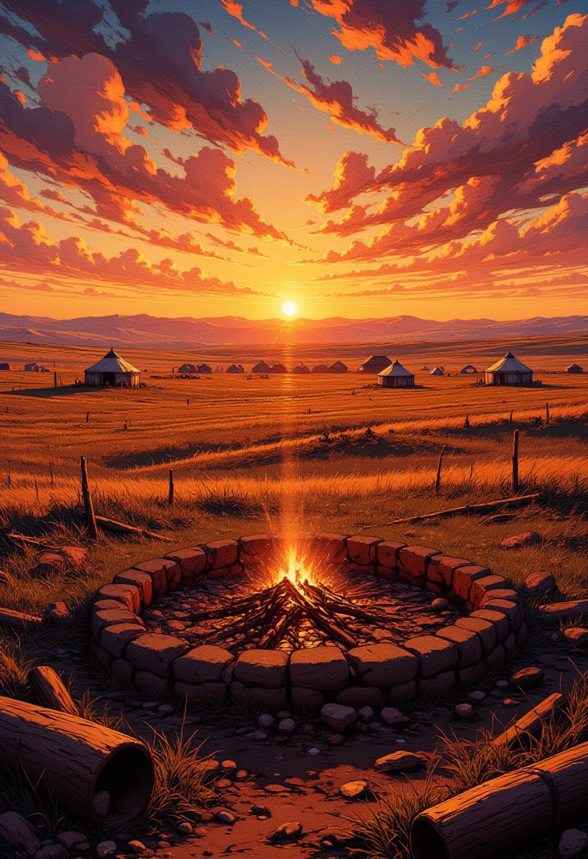 Sunset Over the Mongolian Steppe "The sky burns in shades of gold and crimson as the sun sinks behind the rolling grasslands. A circle of abandoned yurts stands in the distance, their felt coverings stirring slightly in the evening wind. The vastness of the land hums with an eerie quiet, broken only by the occasional cry of an unseen bird. A small fire pit, long extinguished, holds the remnants of a forgotten gathering—scattered stones, charred wood, and a single cup left behind. A breeze picks up, carrying with it the distant echo of hooves on the wind-swept plain."