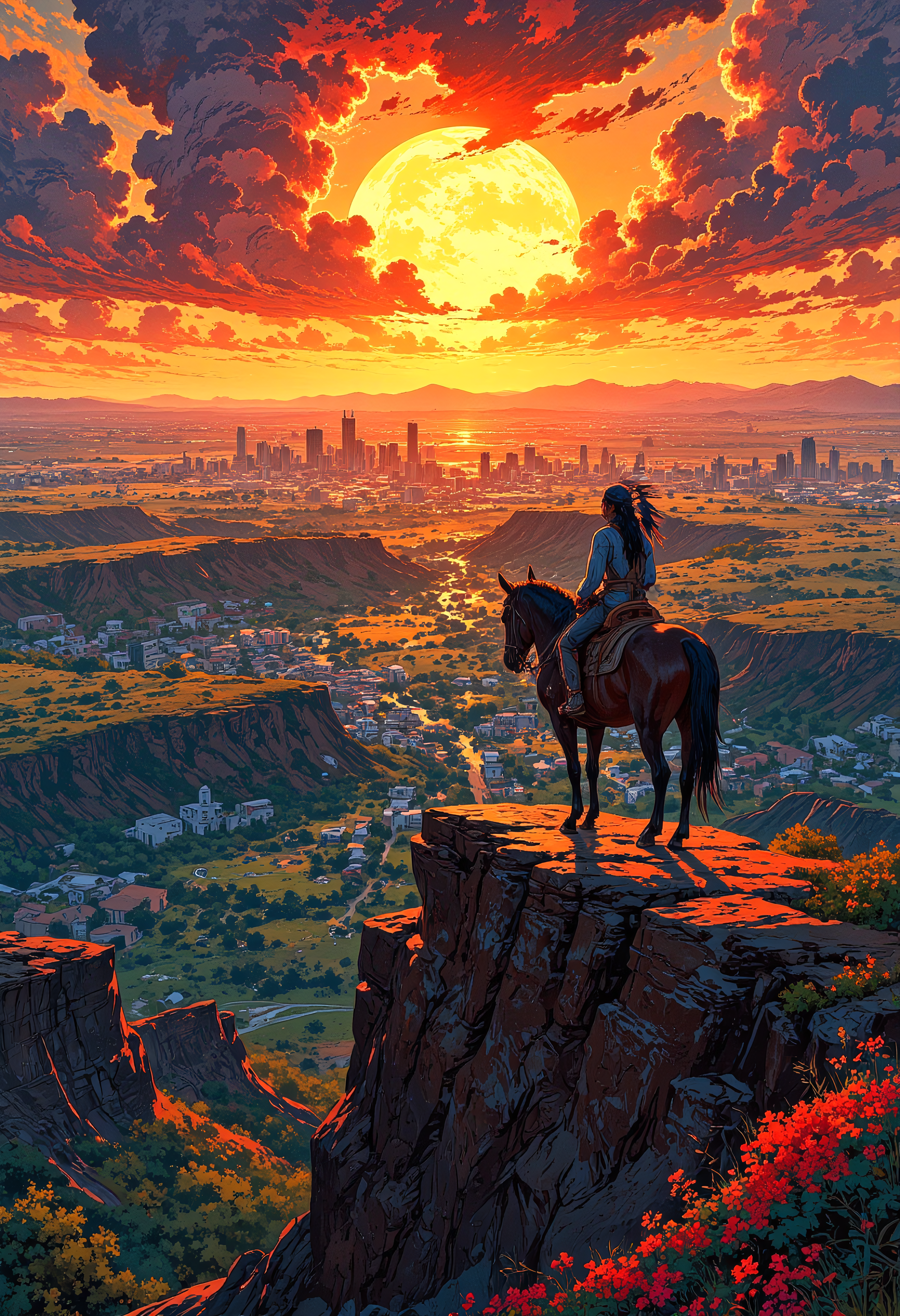 A Sun Lit Native American chief sitting on a Horse on a cliff in the desert, looking down on the great city with high rises in the valley below, evening, the chief is the central focus, vibrant glow