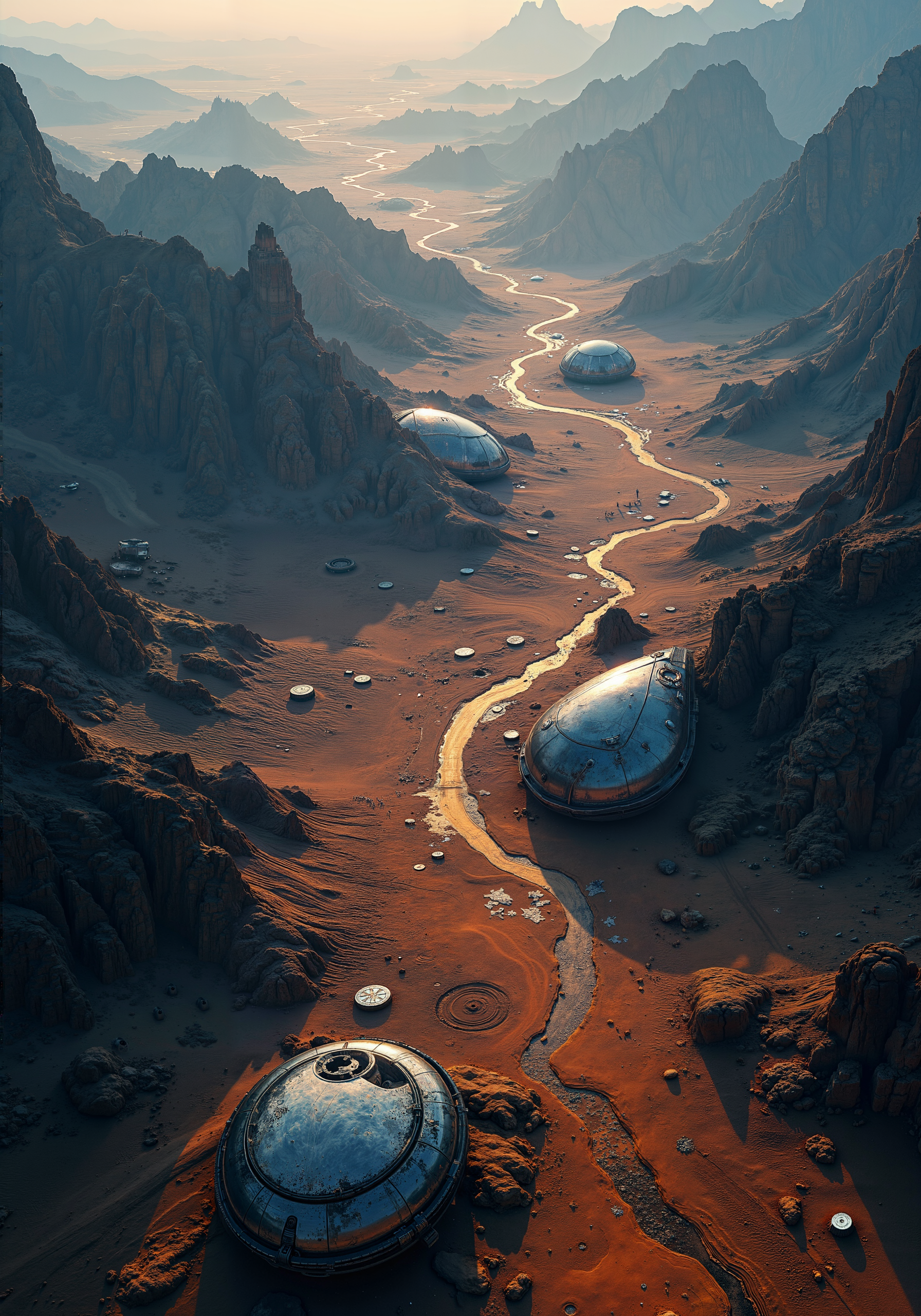 A breathtaking aerial panorama of a vast cosmic desert, where deep textured sandstone dunes merge with scattered, reflective metallic ruins. Expansive composition, intricate contours, and dramatic interplay of shadow and light evoke a surreal, cinematic vista. Ethereal illumination bathes the barren landscape in deep indigo, burnt orange, and glimmering silver, accentuating foil details and ancient futuristic relics. Advanced 8k clarity, masterpiece quality, and ultra-detailed textures reveal high altitude spatial dynamics and evocative color palettes that emphasize surreal scale and enigmatic mystery. <lora:Chris_Luka:0.3> <lora:Fluxartis 28.11A:0.2> <lora:flux_dev:1>