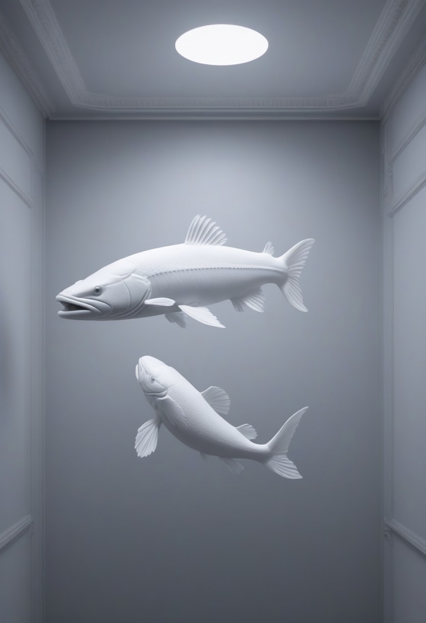 8k analog photo, 3d printed white Coelacanth swimming in the air in the luxury dark room, minimalist,