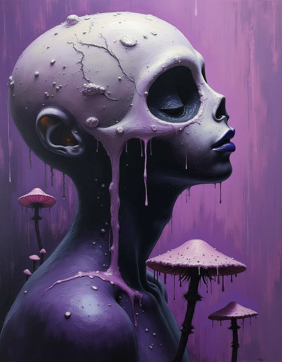 purple white and black , oil painting profile, from the waist up, sharp focus, (biopunk:1.3) and (dark fantasy:0.5) and (retrofuturism:1.1), mushrooms, mucus dripping, (man:0.3). flat saturated dirt color background, in the style of gerald brom and Joseph Cross.