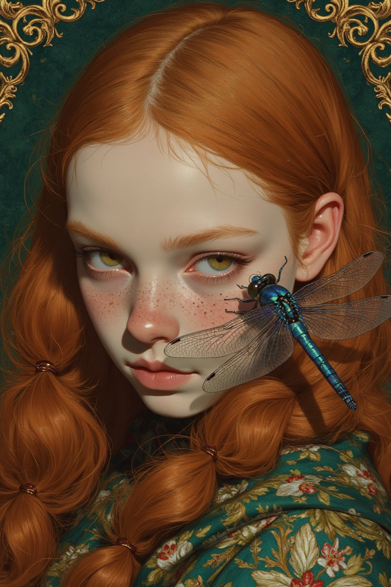 animaport of a fair-skinned medieval woman with long, wavy auburn hair, her serene expression disrupted by a luminous blue dragonfly delicately resting on her cheek, its iridescent wings casting a subtle shimmer across her face. The deep emerald background is enriched with an intricate golden filigree embroidery pattern, reminiscent of royal tapestries, adding a regal contrast to the scene. The interplay of textures, from the softness of her skin to the fine detailing of the dragonfly’s fragile wings, creates a mesmerizing visual balance.