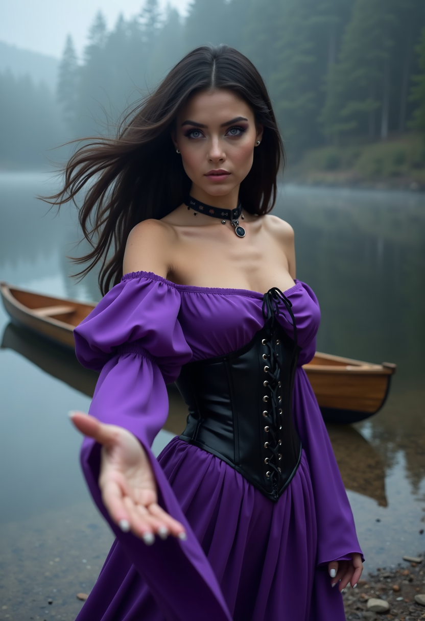 An artistic color photograph of a woman with long dark hair blowing in the wind, and piercing purple eyes wearing a purple C0tt@g3Dr355, an off-the-shoulder dress with a fitted black corset bodice featuring lace-up detailing in the front. The C0tt@g3Dr355 has long, billowy sleeves that drape elegantly and a flared skirt with a soft, flowing hem. The fabric appears to be satin or silk with a sheen. She holds out one hand towards the viewer, beckoning. She wears a pendant choker necklace, makeup and eyeliner. She stands on the shore of a misty lake in a dark forest, a wooden rowing boat can be seen in the background.