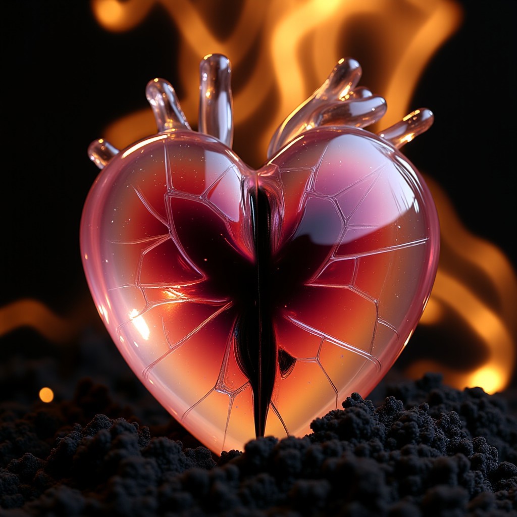 Close-up shot of a shattered glass heart, bisected along its central axis, revealing a dark, ominous core. Soft, golden light pours down from above, bathing the scene in a warm, ethereal glow. The surrounding environment is a blurred haze of black lava and ash, adding depth and mystery to the composition. The level of detail is meticulous, with each shard of glass and every texture rendered in high definition.